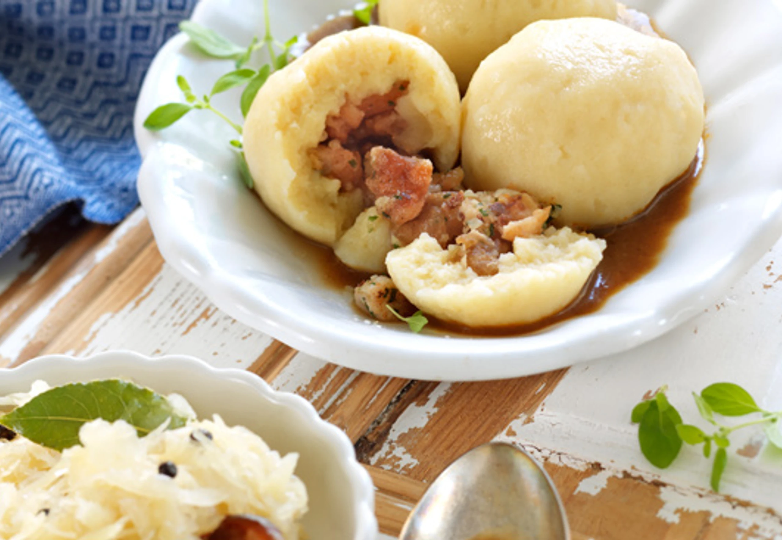 - Salzwasser aufkochen, Knödel einlegen und ca. 12 Minuten köcheln. Knödel mit Kraut und evtl. Bratensaft anrichten.