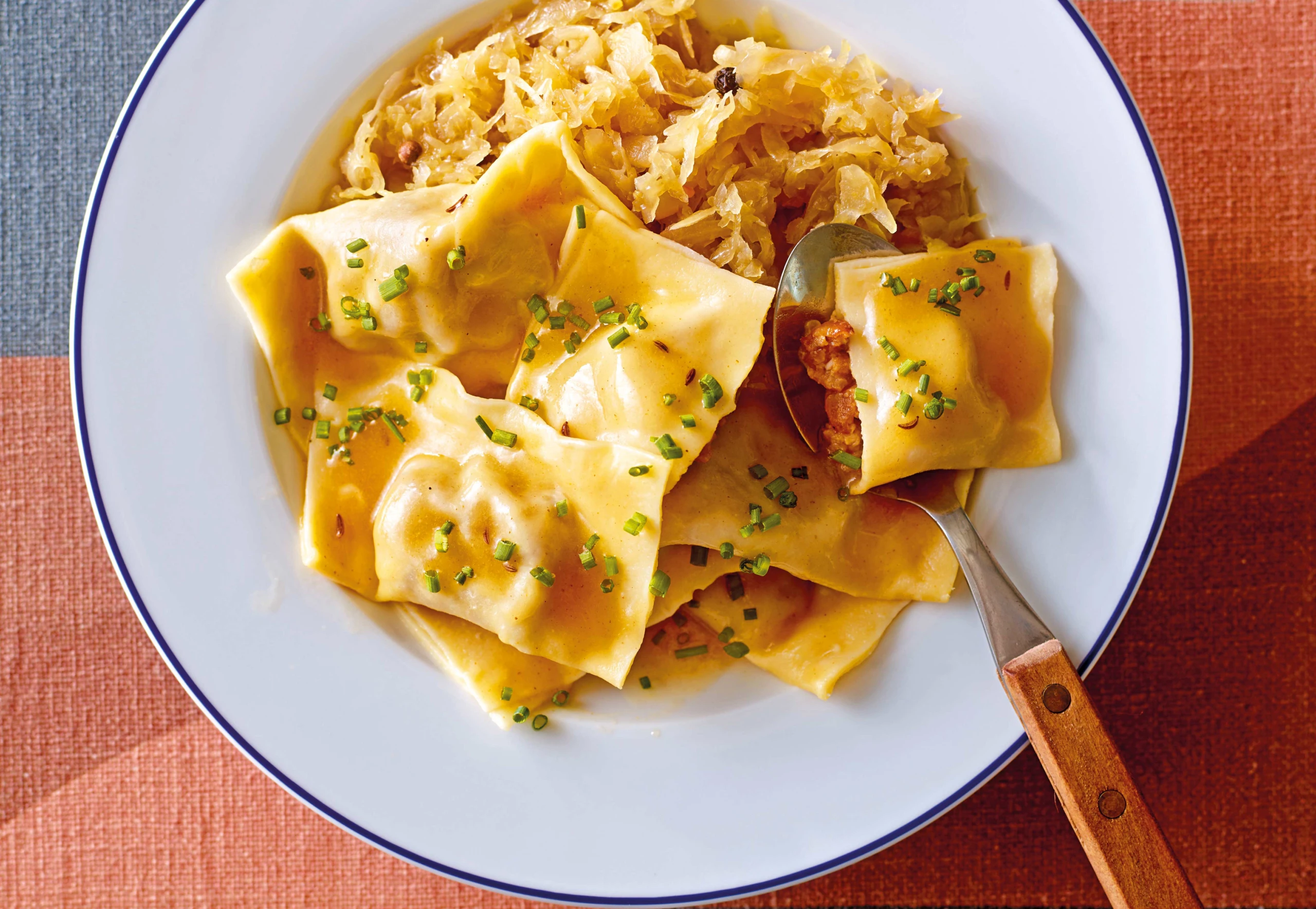 Reichlich Salzwasser aufkochen, Tascherl darin ca. 8 Minuten kochen. Parallel dazu Bratensaft aufkochen. Tascherl herausheben, abtropfen lassen, mit dem Kraut anrichten, mit wenig Bratensaft übergießen und mit Schnittlauch bestreut servieren.