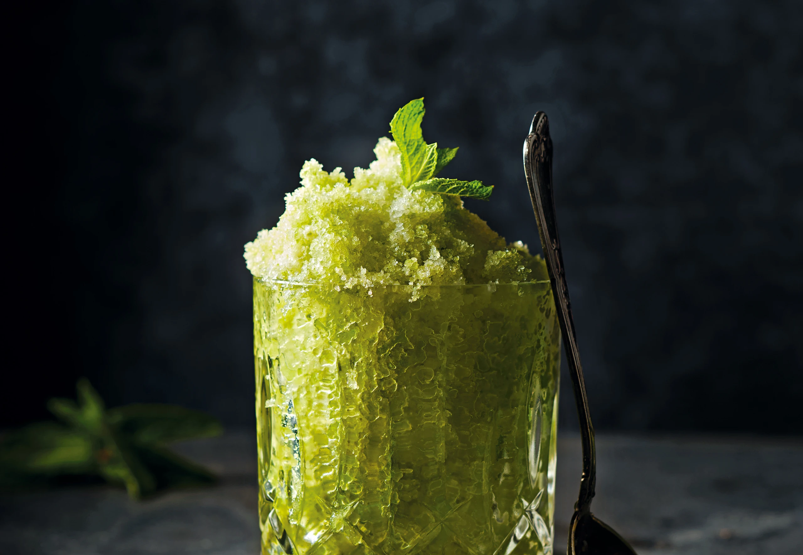 Granité aus dem Tiefkühler nehmen und mit einem Suppenlöffel abschaben. Sofort mit Minzblättchen garniert servieren.