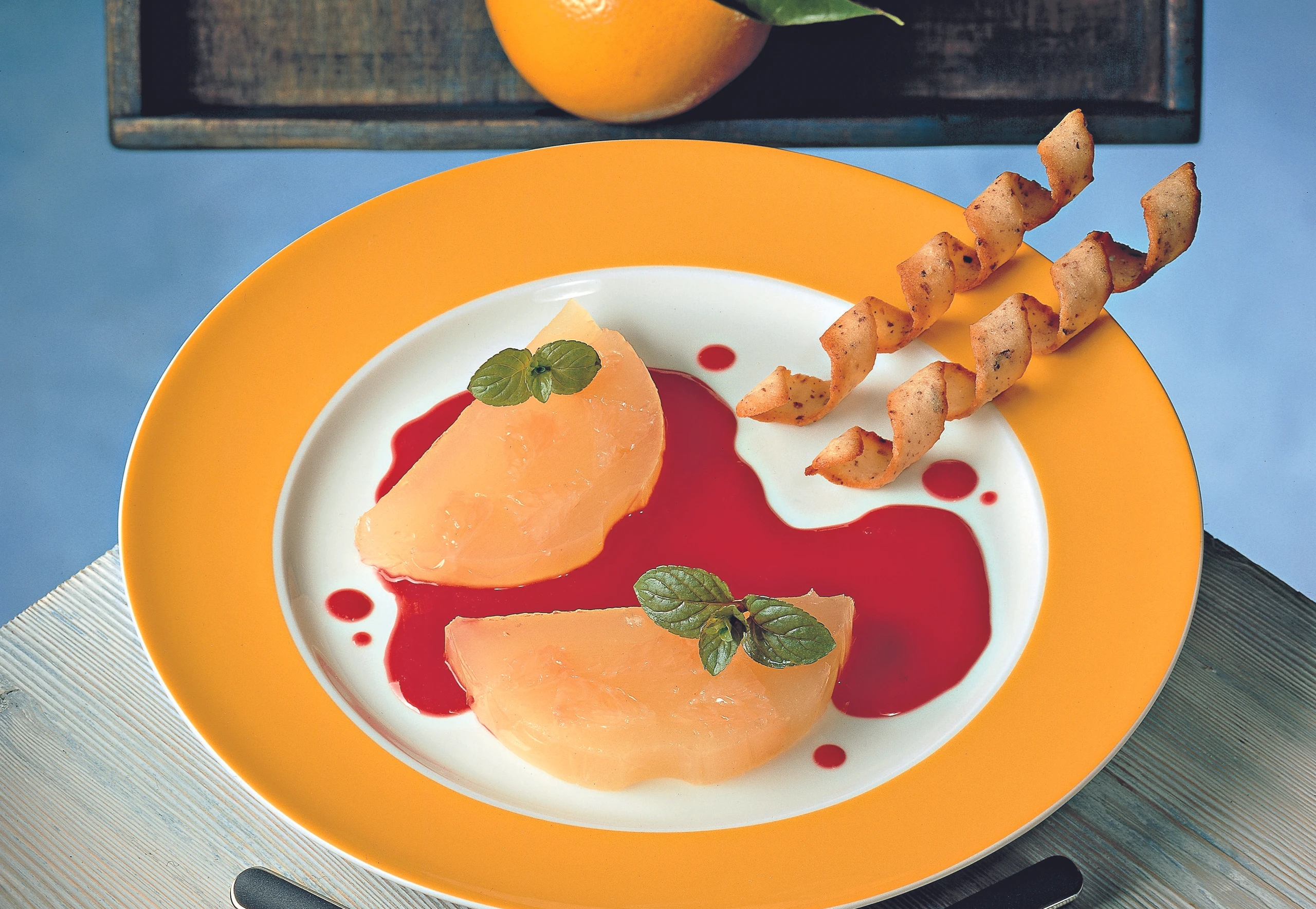 Gelatine in kaltem Wasser einweichen. Wenig vom Grapefruitsaft mit dem Zucker verrühren und erwärmen, gut ausgedrückte Gelatine darin auflösen und mit restlichem Saft vermischen. Grapefruitfilets untermischen und kurz ziehen lassen.