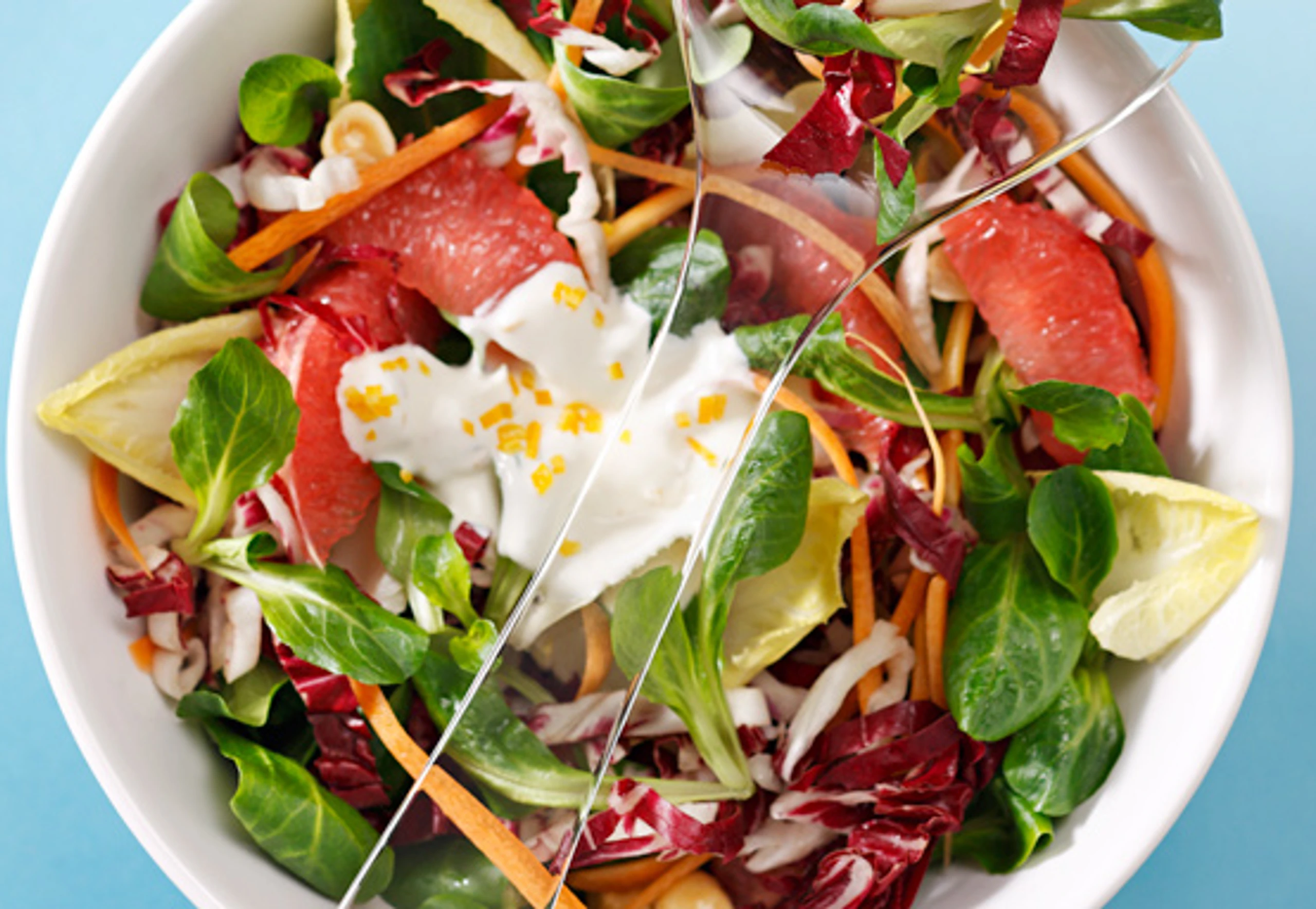Grapefruitspalten, Radicchio, Chicorée, Vogerlsalat, Karotten, Zwiebel und Haselnüsse mit dem Dressing vermischen.