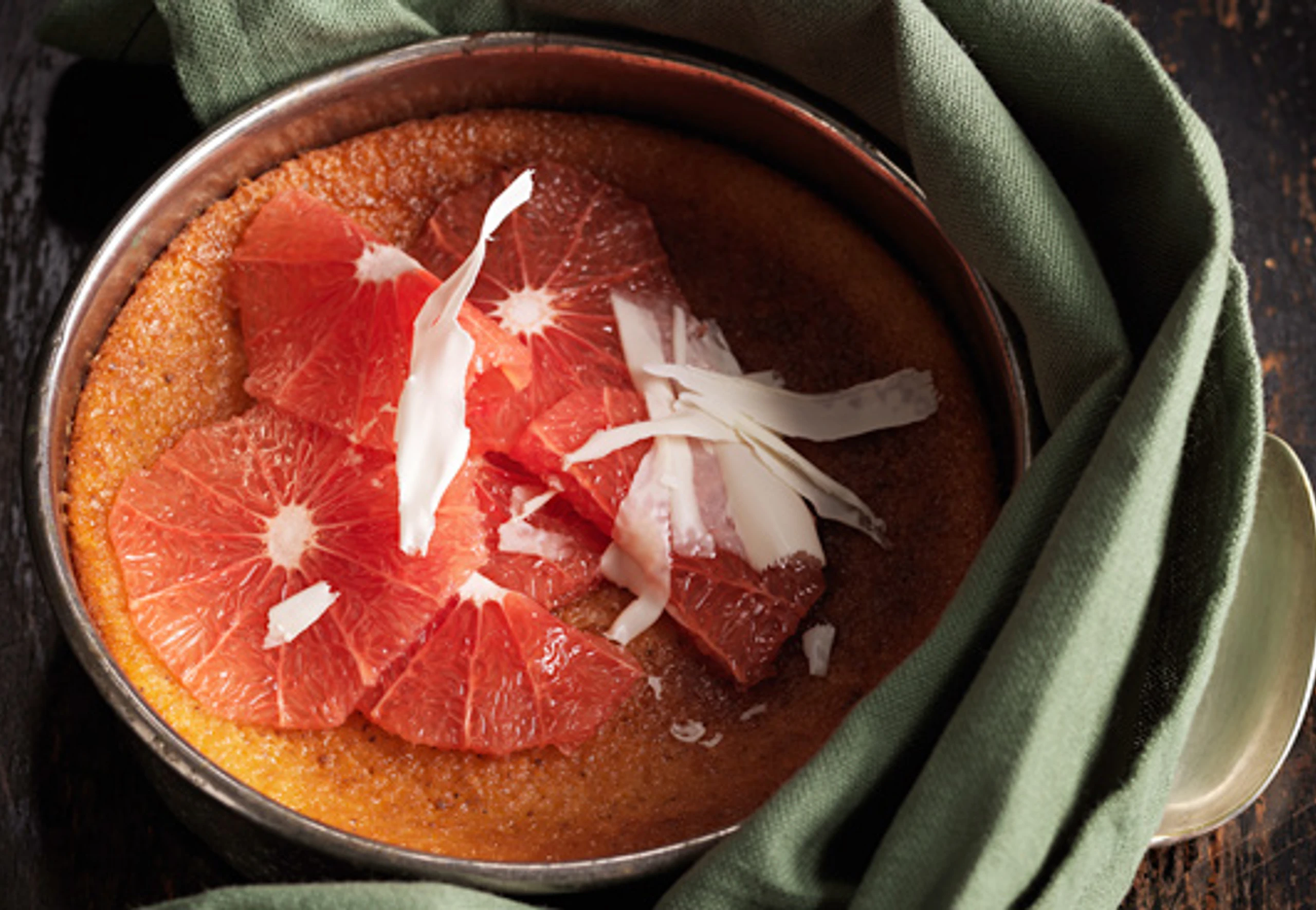 Mehl mit Backpulver vermischen. Butter bei schwacher Hitze bis zur leichten Braunfärbung erhitzen. Mehlmischung, Butter, Eier, Zucker, Orangenschale, Milch und Grapefruitsaft zu einer glatten Masse verrühren. Masse in die Form füllen und im Rohr (mittlere Schiene / Gitterrost) ca. 50 Minuten backen. Torte herausnehmen und auskühlen lassen.