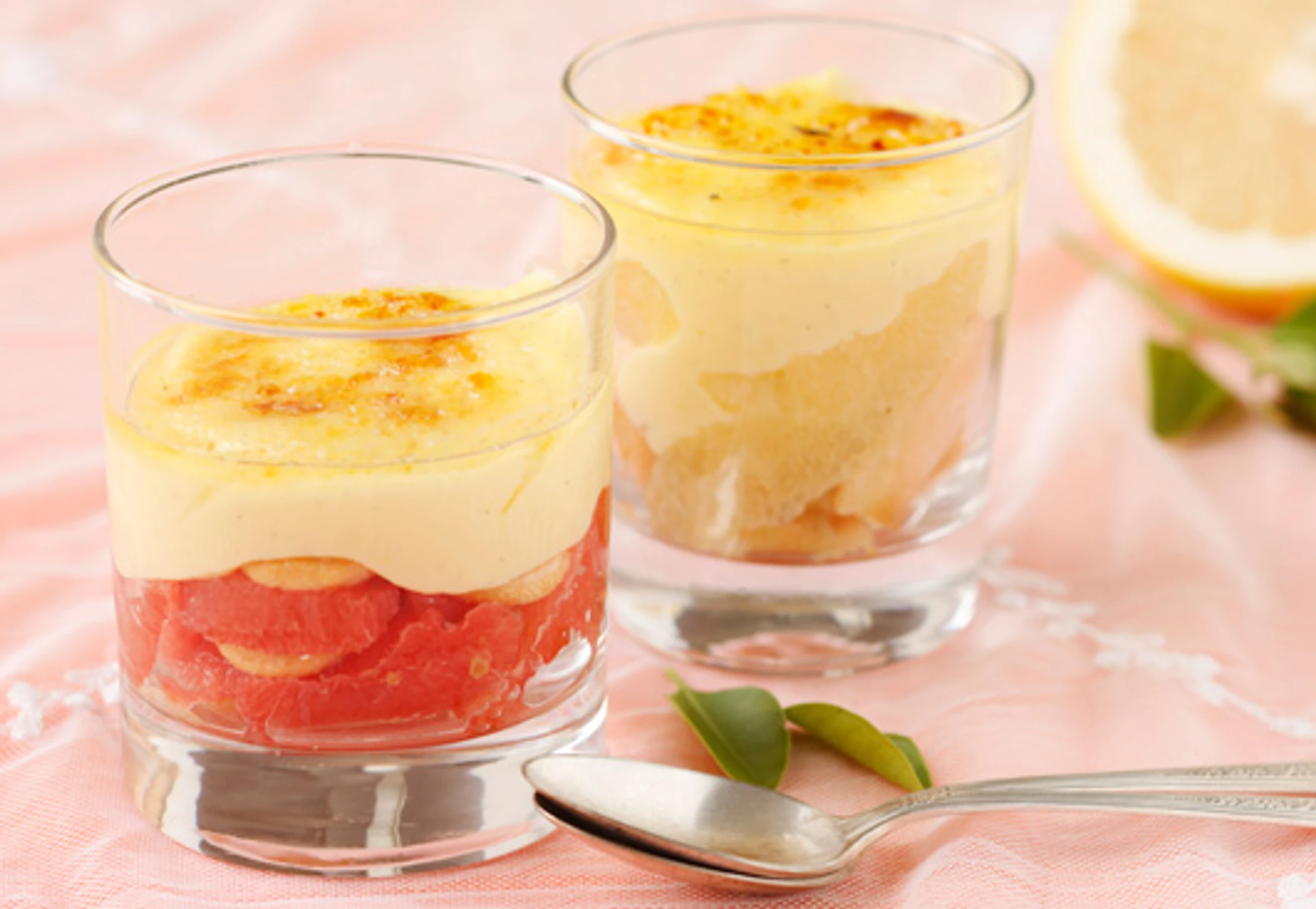 Sechs Gläser (Inhalt 250 ml) vorbereiten. Grapefruits mit einem scharfen Messer so schälen, dass auch die weiße Innenhaut entfernt wird. Fruchtfleisch in ca. 0,5 cm große Stücke schneiden, austretenden Saft auffangen. Biskotten in Stücke brechen, mit Grapefruitstücken und -saft verrühren und in den Gläsern verteilen.