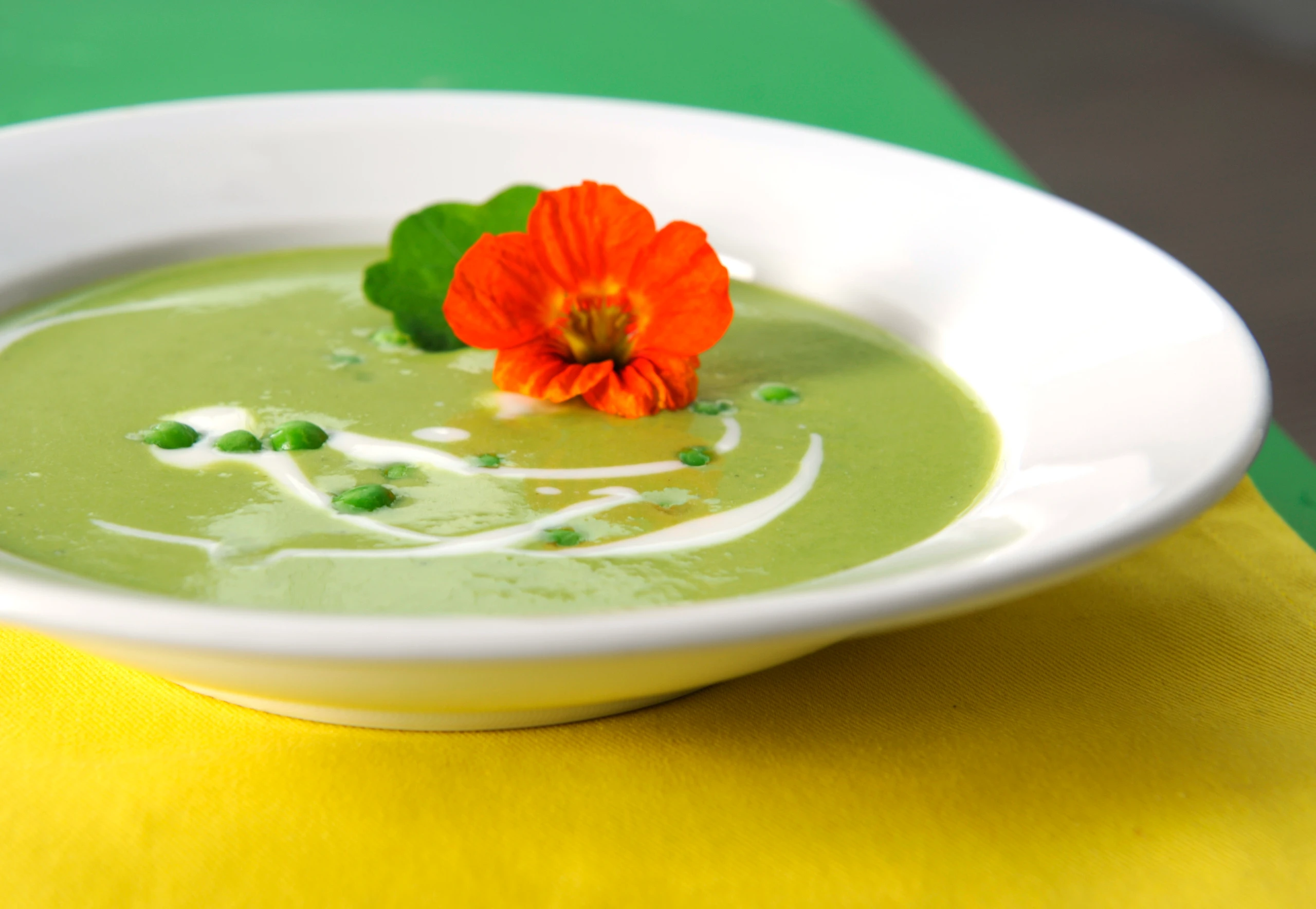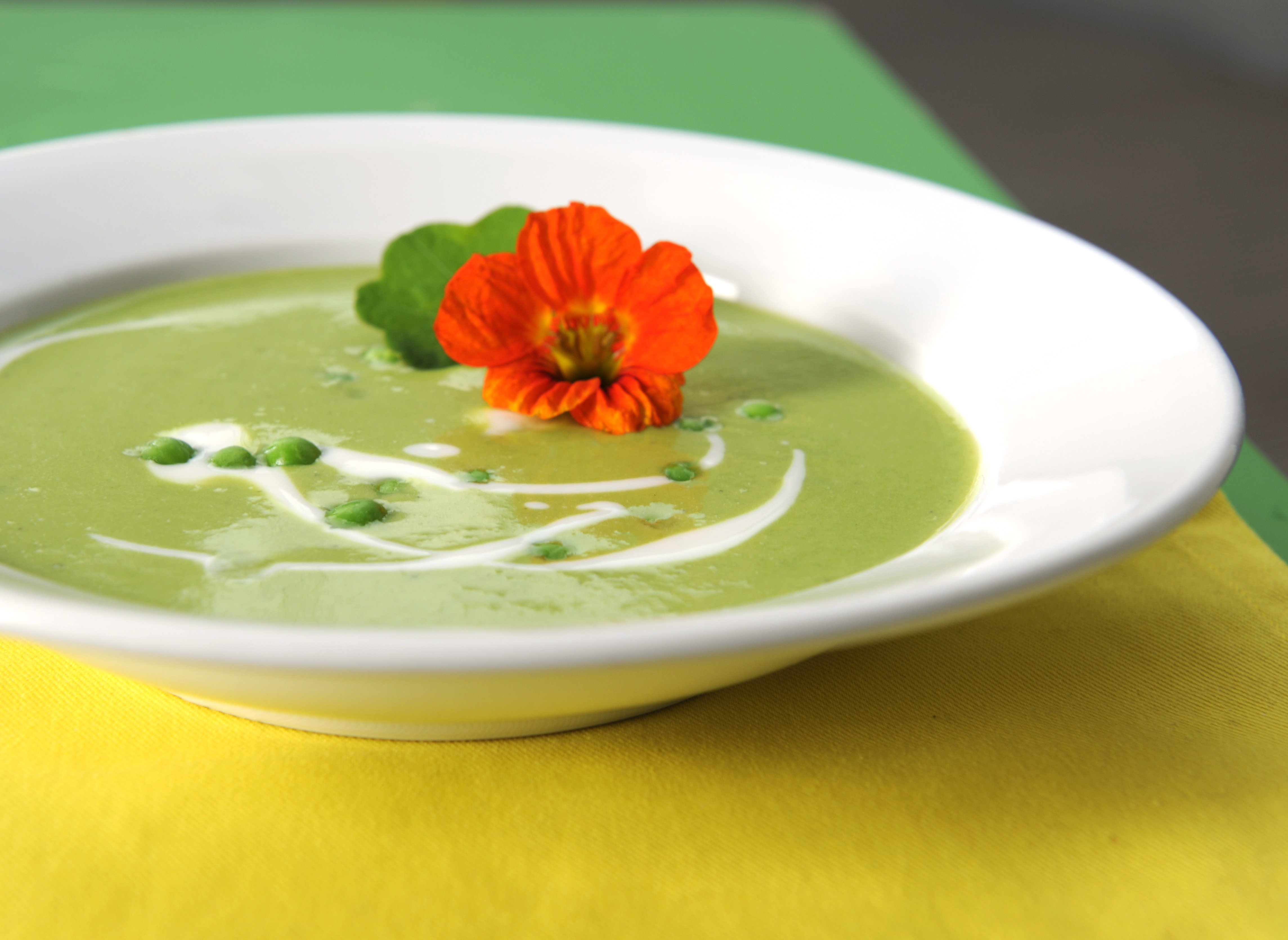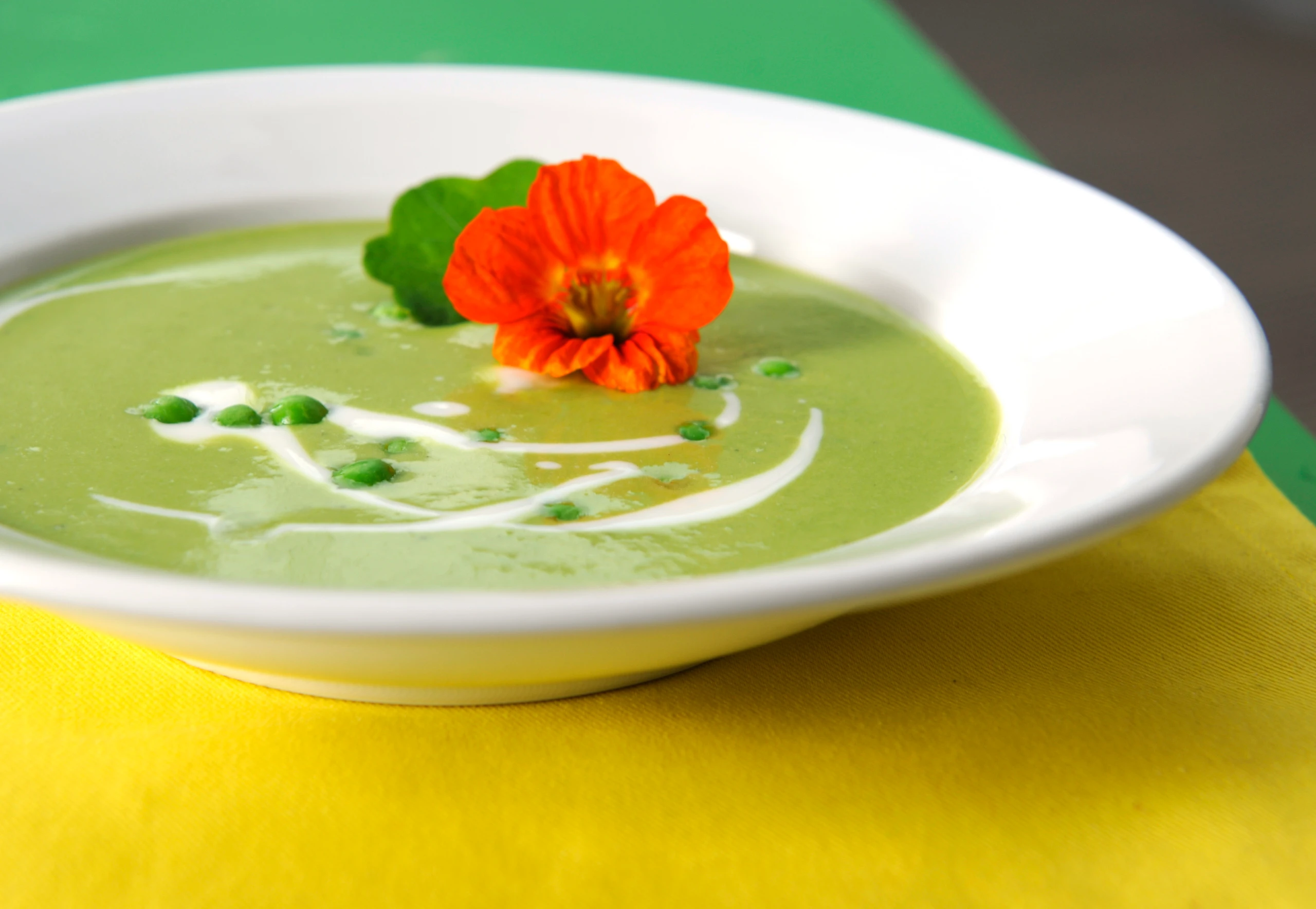 Suppe zum Kochen bringen, tiefgekühlte Erbsen dazugeben. Suppe 5 Minuten köcheln.