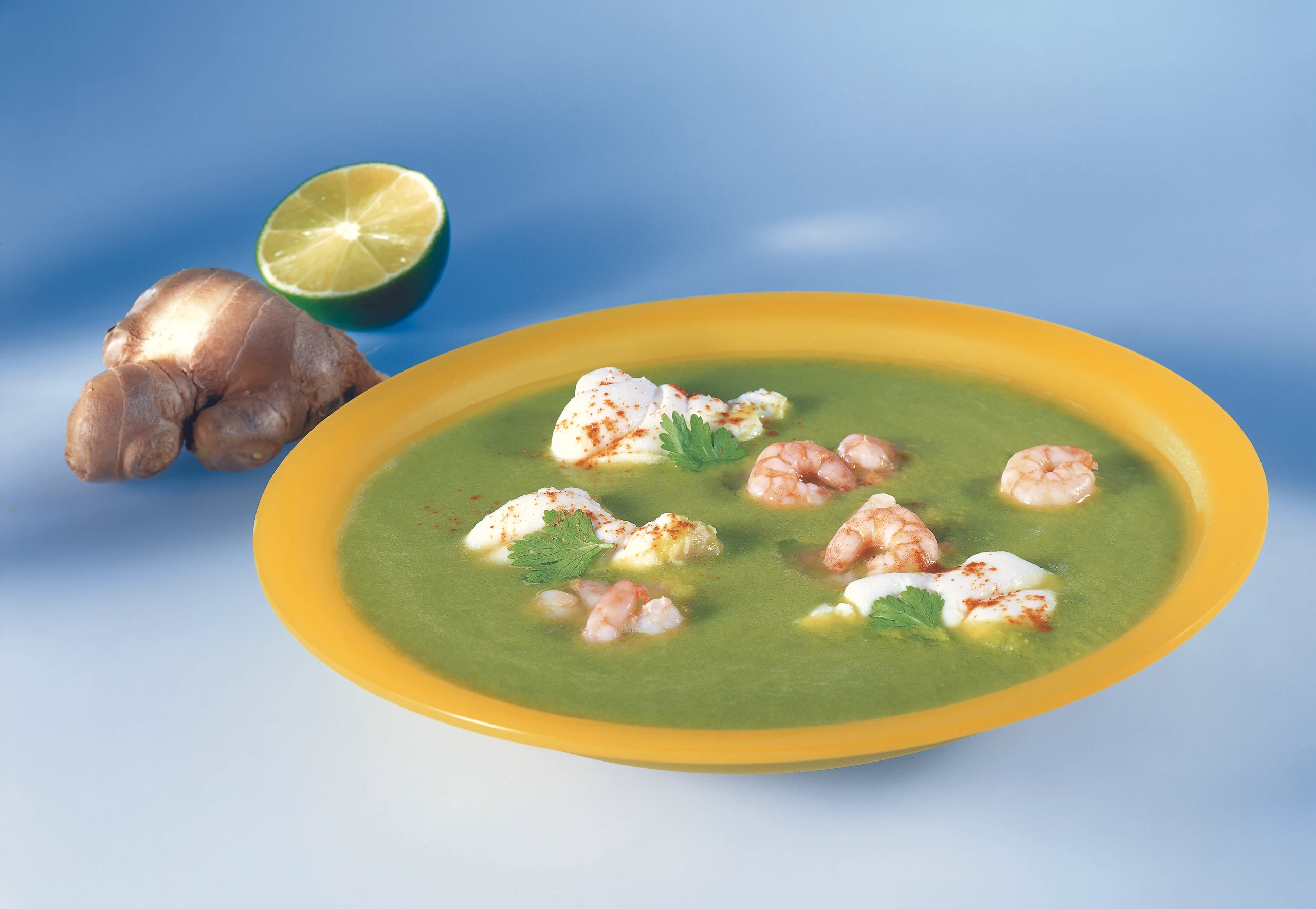 Grasgrüne Fischsuppe mit Limetten