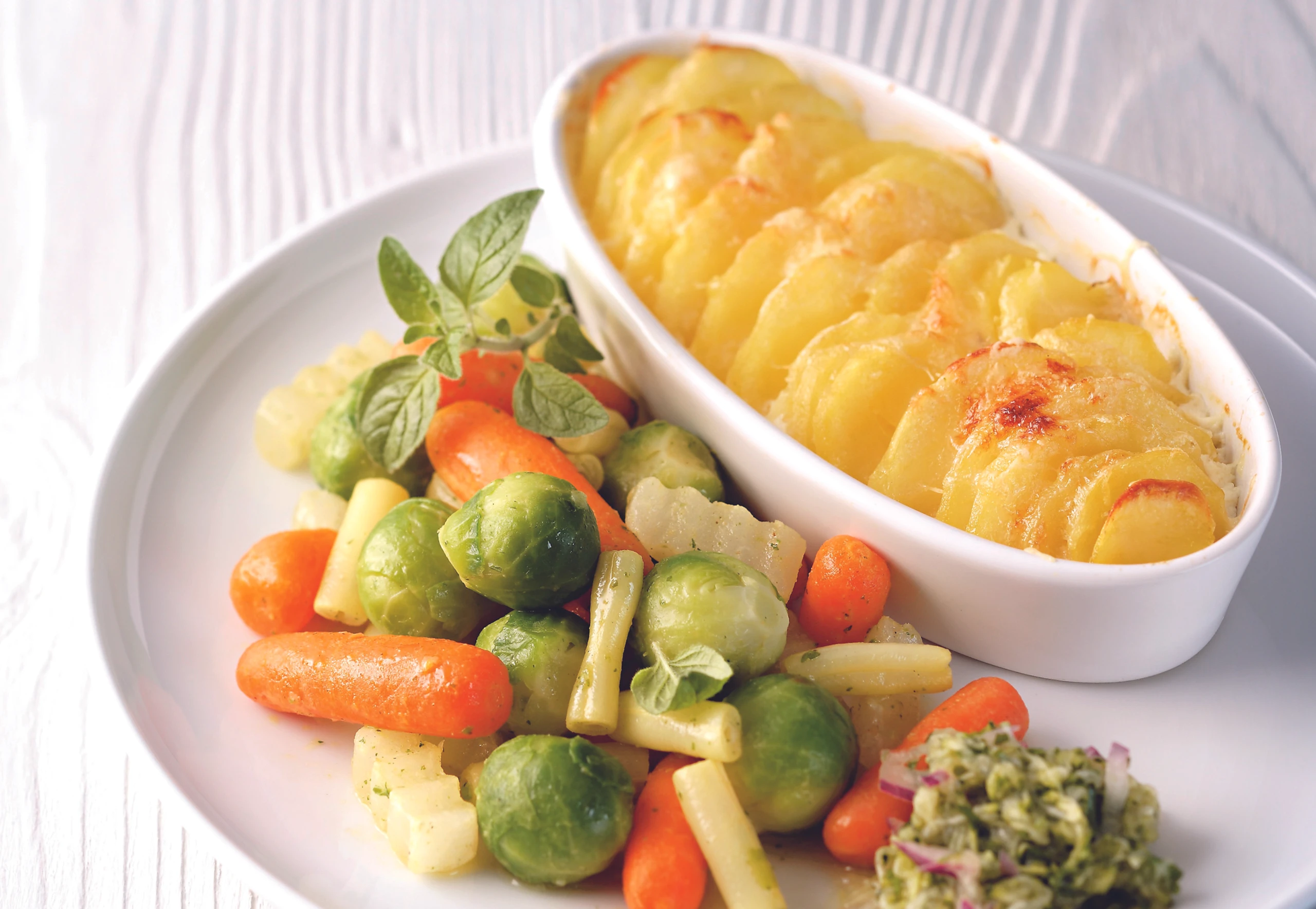 - Röstgemüse nach Anleitung zubereiten. Für die Salsa Zucchini mit Kräutern und Zitronensaft vermischen, salzen und pfeffern. Gratin mit Gemüse und Kräuter-Salsa servieren.