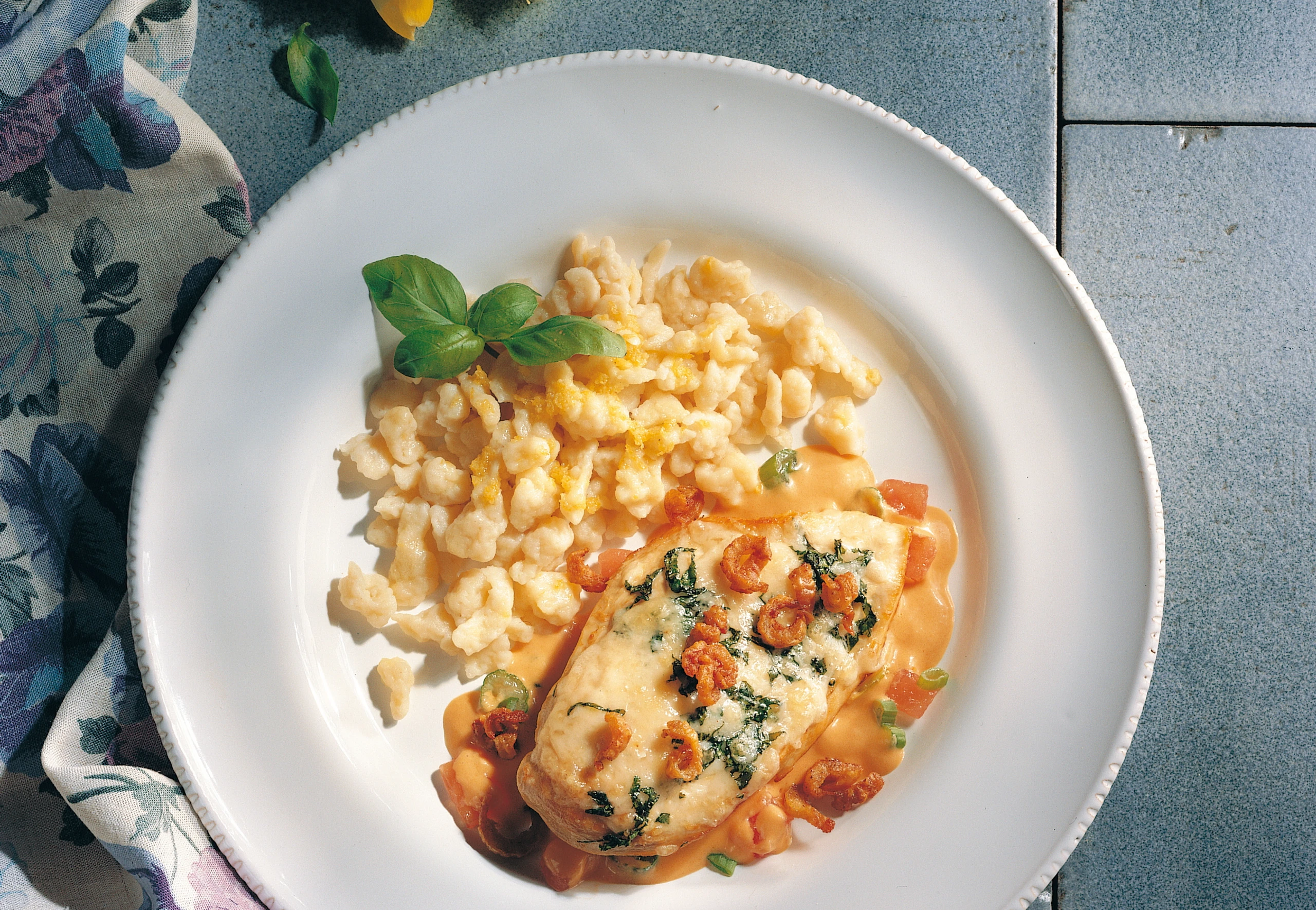 Gratinierte Hühnerbrust mit Jungzwiebel-Paradeis-Sauce