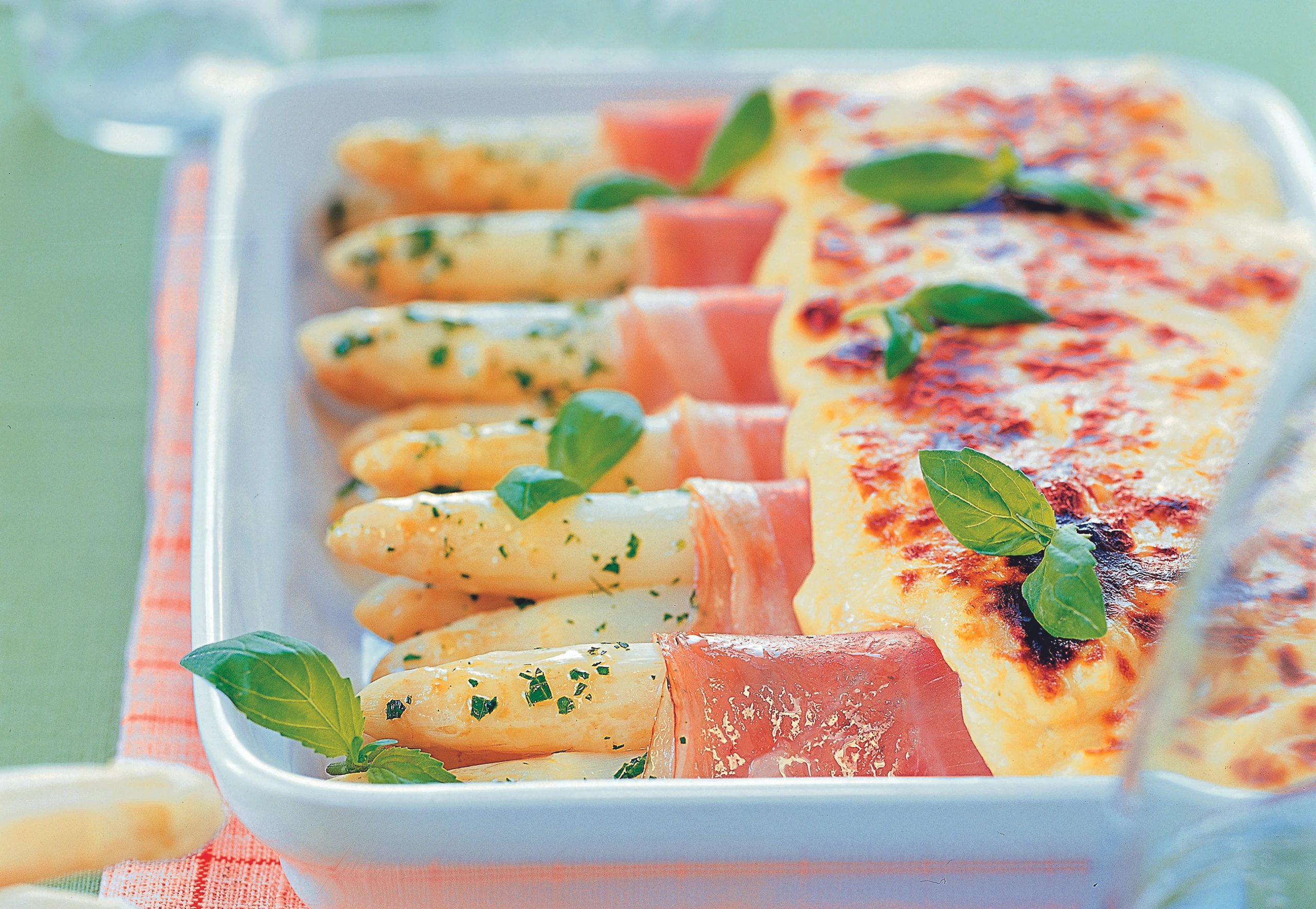 Gratinierte Spargel-Schinkenrollen mit Basilikum