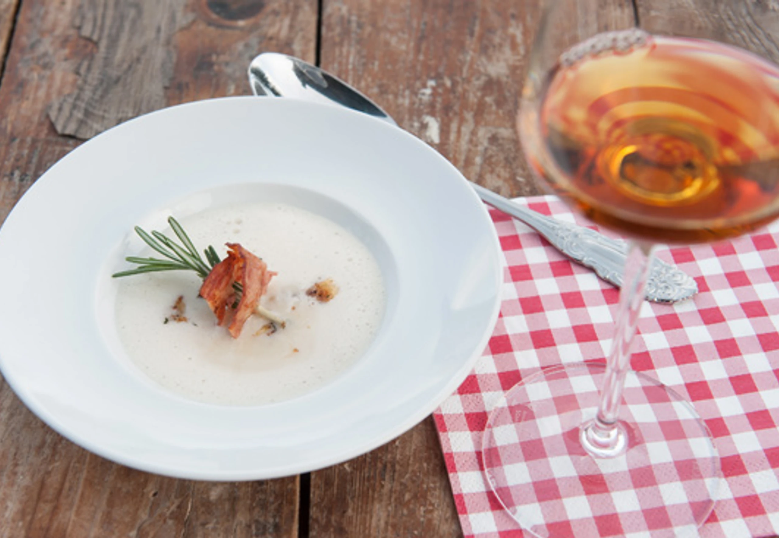 - Suppe pürieren, anrichten und mit den Speckspießen garniert servieren.