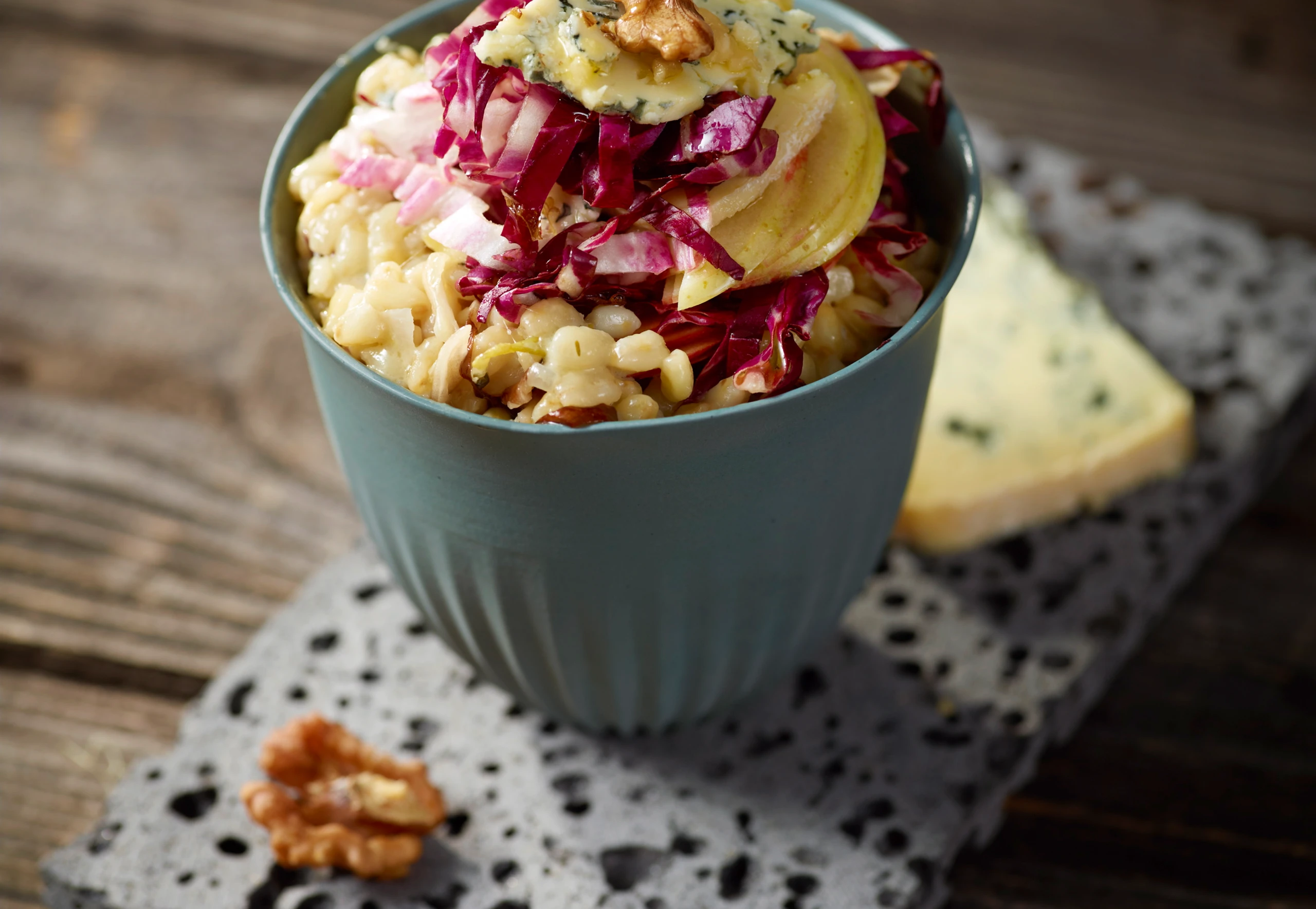 - Radicchio putzen, vierteln und in dünne Streifen schneiden. Petersilie hacken. Bergkäse reiben, Gorgonzola zerbröseln. Vom Apfel das Kerngehäuse ausstechen, Apfel in feine Scheiben scheiden. Etwas vom Radicchio, Gorgonzola und Apfel für die Garnitur beiseite legen, den Rest sowie Bergkäse und Petersilie unter das Risotto mischen. Risotto anrichten, mit Radicchio, Apfel, Gorgonzola und Nüssen garniert servieren.