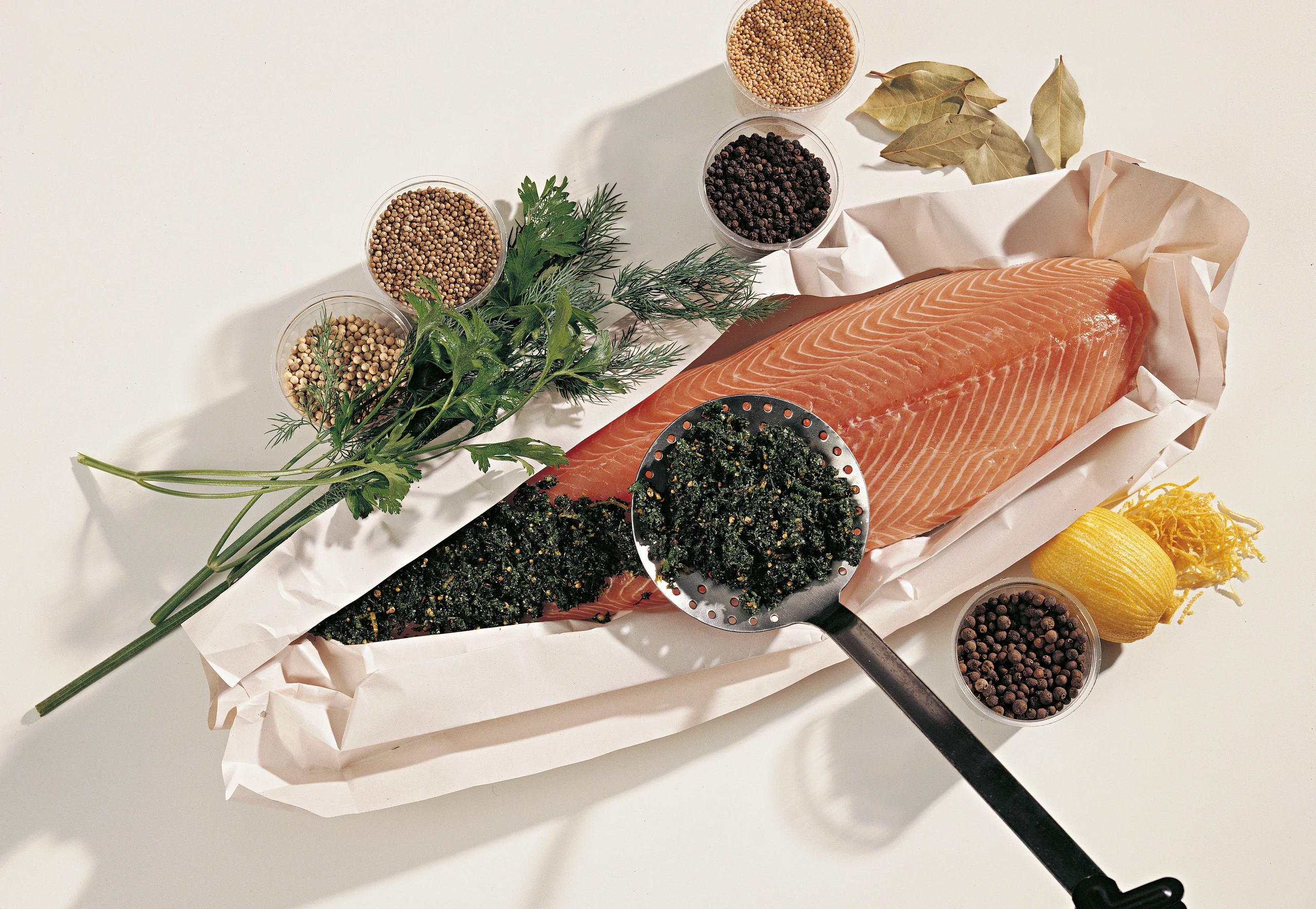 Fisch mit restlicher Kräutermischung bestreuen, mit Öl beträufeln, im Papier einwickeln und 24 Stunden im Kühlschrank ziehen lassen.