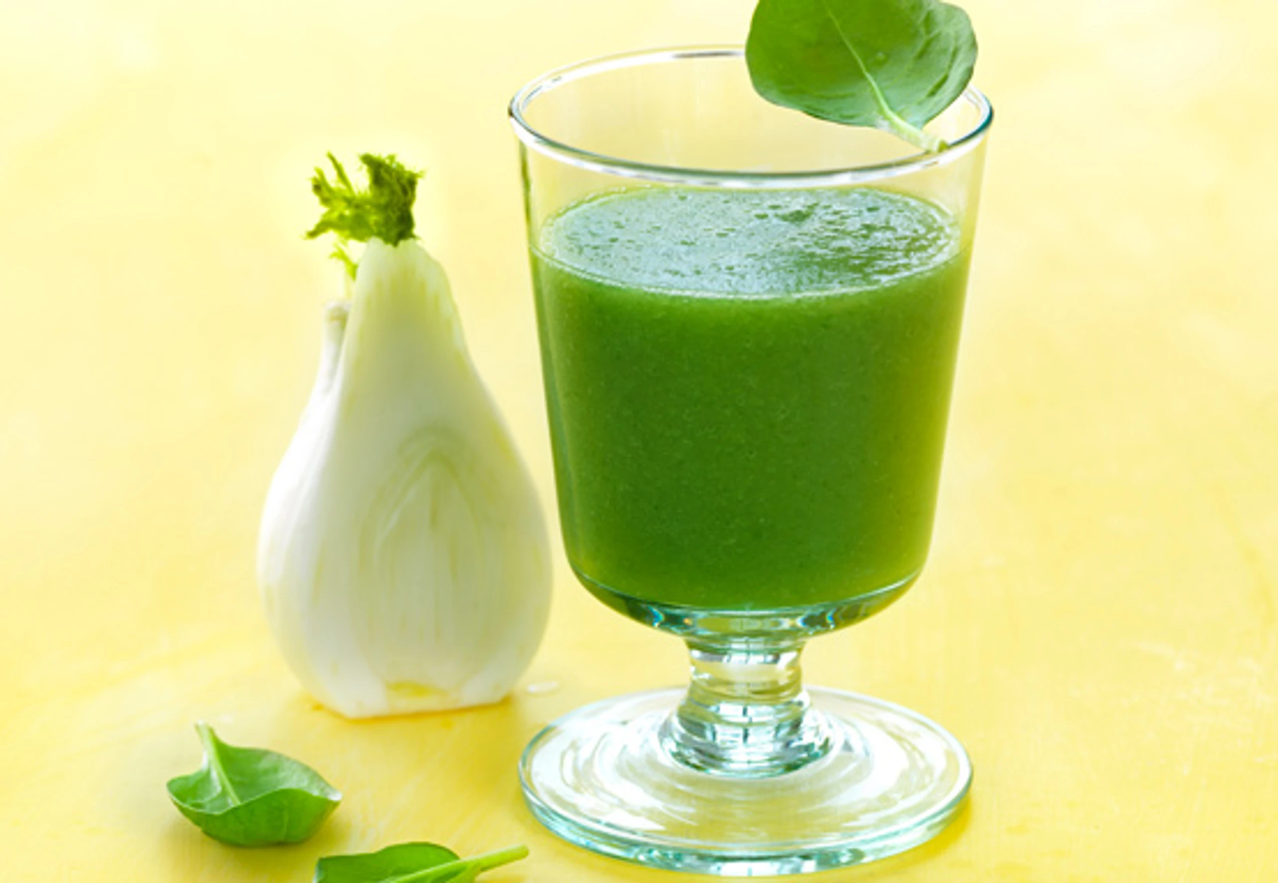 - Obst, Fenchel, Spinat, Zitronensaft und Wasser mit dem Mixstab pürieren und in Gläser füllen.