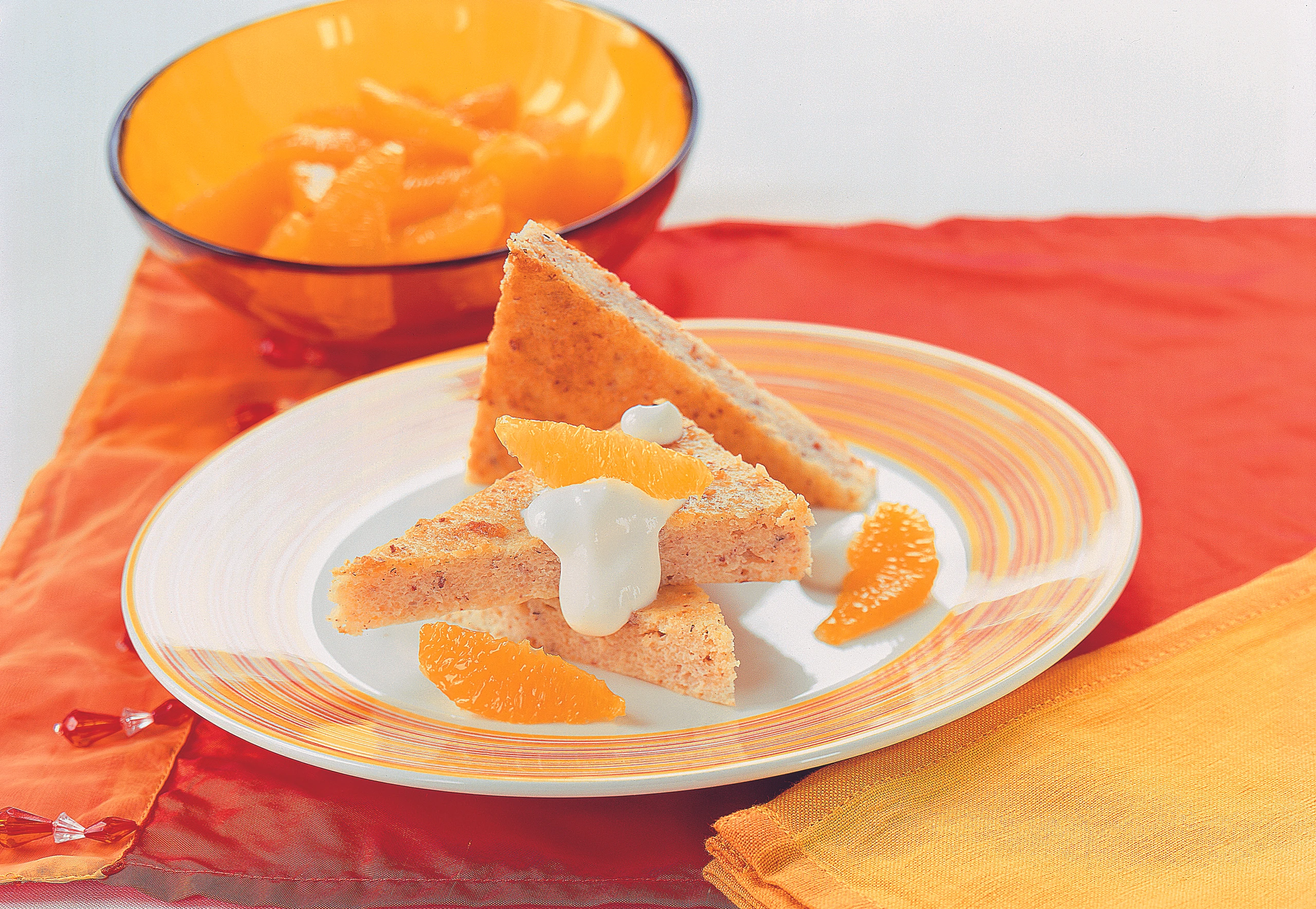 Kuchen aus dem Rohr nehmen und abkühlen lassen. Kuchen in gleich große Dreiecke schneiden, auf Tellern anrichten, mit Sauerrahm und Orangenfilets garnieren.