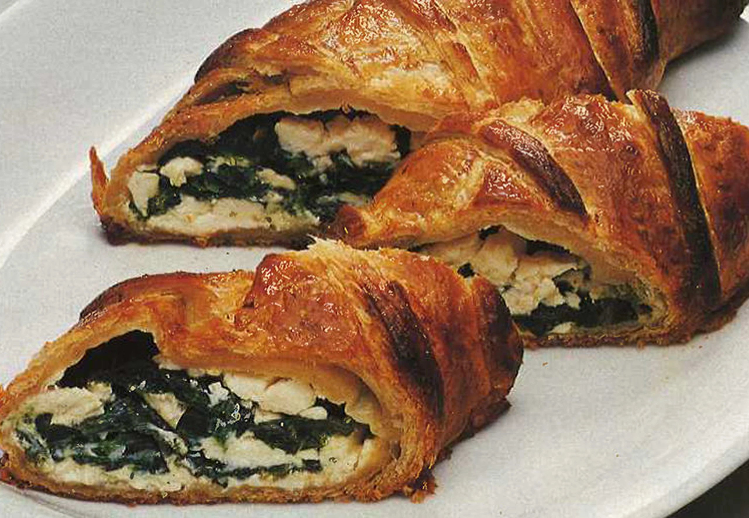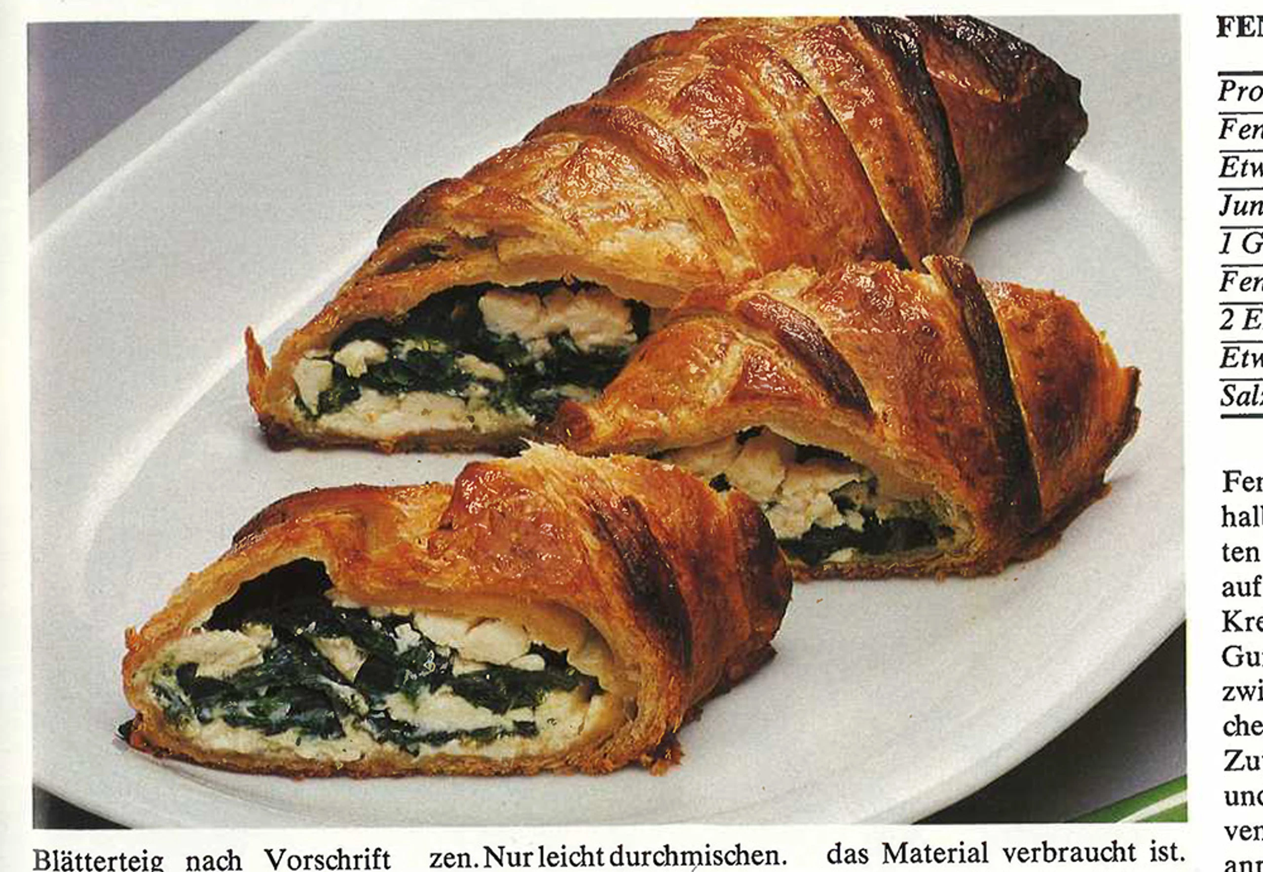 Blätterteig auf einem mit Wasser benetzten Backblech aufrollen. In der Mitte des Teiges legt man nun einen länglichen Streifen mit Spinat auf. Darauf verteilt man locker etwas zerbröckelten Schafkäse und gießt darüber etwas leicht gebräunte Butter oder Margarine.