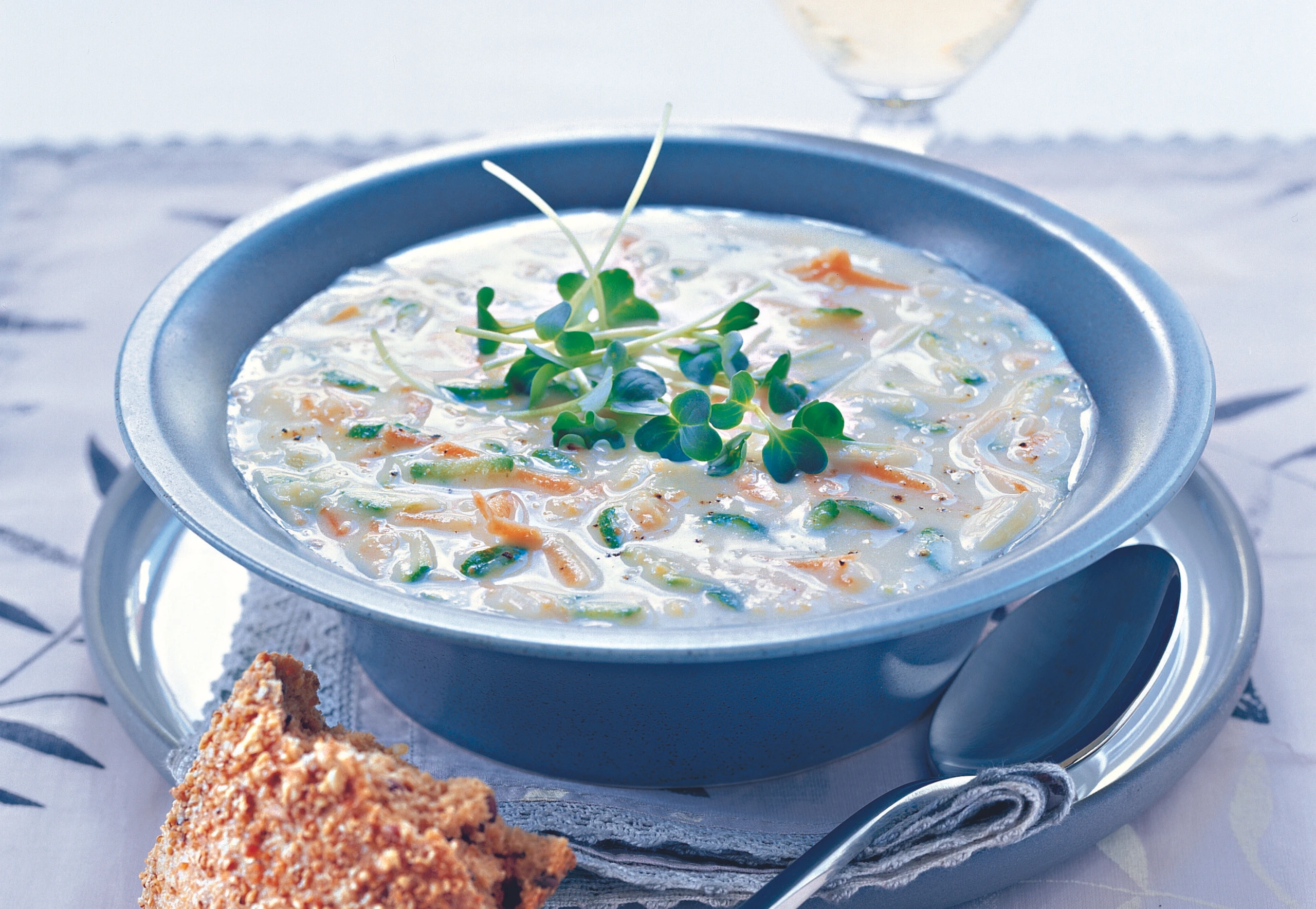 Zwiebel schälen und klein schneiden. Zwiebel und Grieß unter Rühren in der Butter anschwitzen, mit Suppe aufgießen und unter Rühren aufkochen. Gemüse und Obers zugeben. Suppe ca. 10 Minuten köcheln, mit Salz, Pfeffer, Muskat und wenig Zitronensaft würzen. Suppe mit Kresse bestreut servieren.