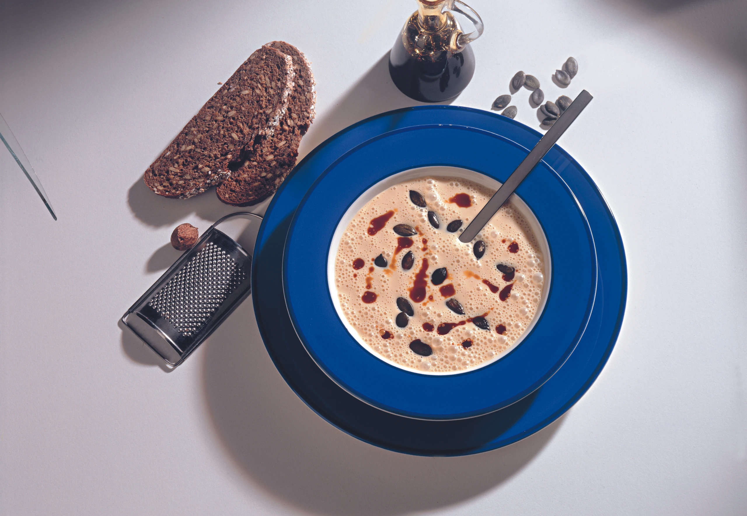 Suppe in vorgewärmte Teller schöpfen, mit Kürbiskernen bestreuen und mit Kernöl beträufeln. Dazu serviert man am besten Vollkornbrot.