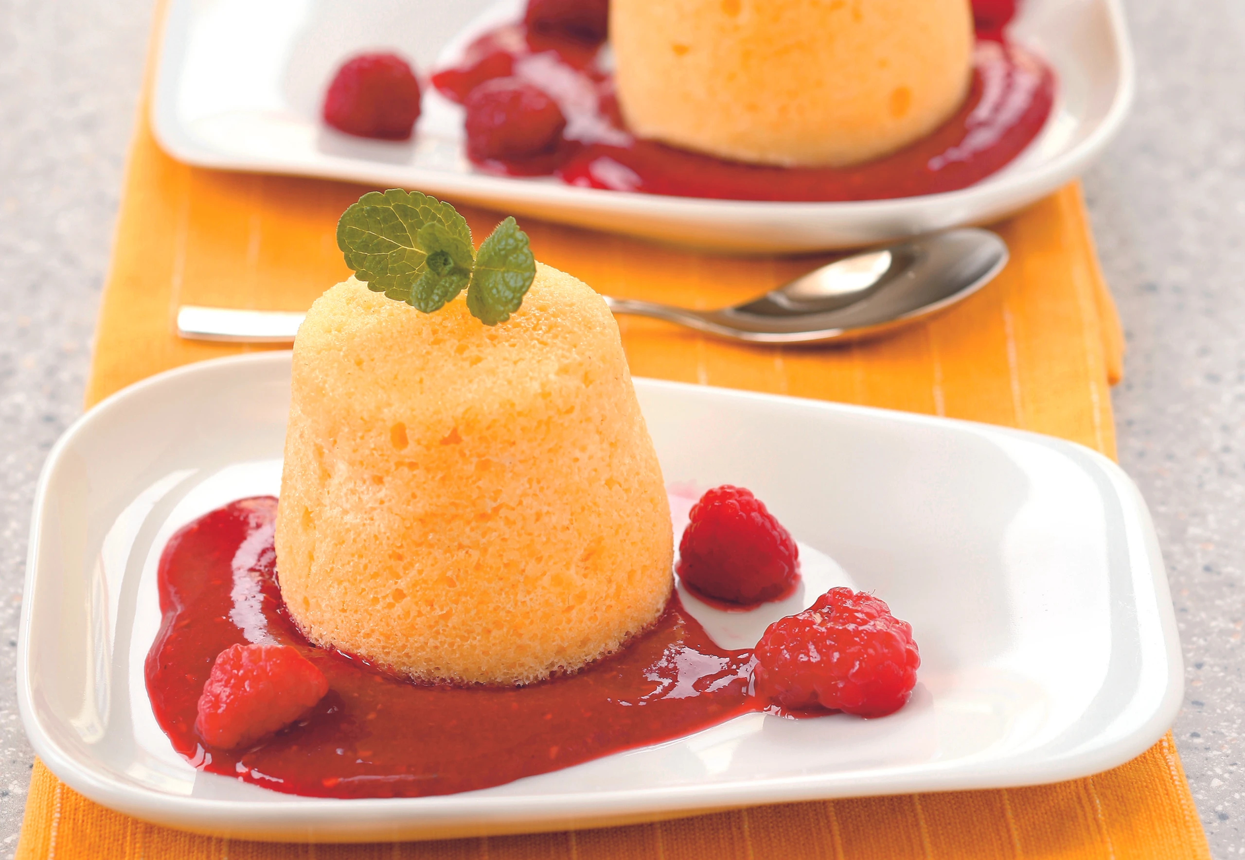 Ca. 10 Himbeeren für die Garnitur reservieren. Übrige Beeren mit Vanillezucker und Zitronensaft pürieren, durch ein Sieb streichen. Aufläufe mit der Sauce anrichten, mit Minze und Beeren garnieren.