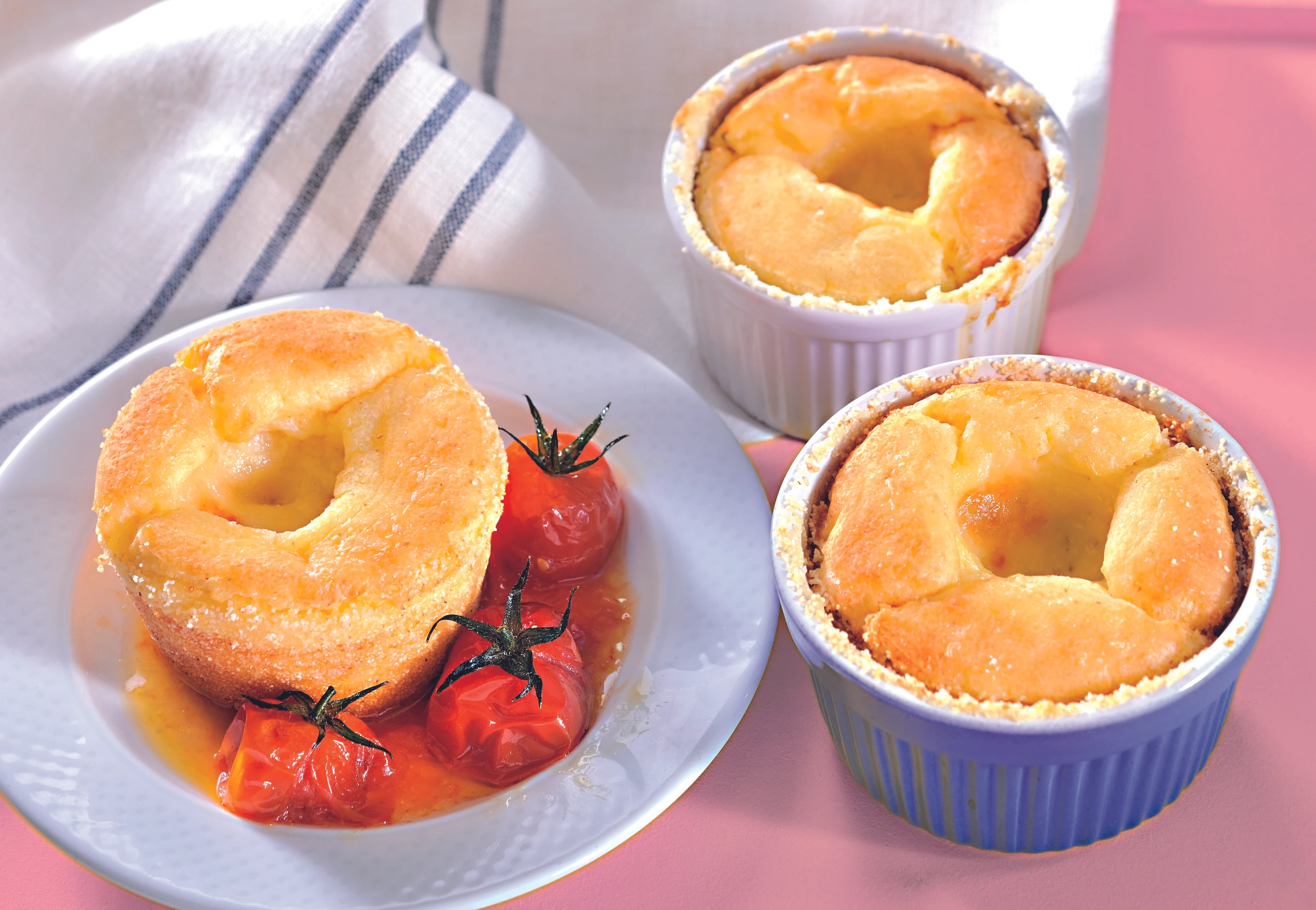 In einer Pfanne Olivenöl erhitzen, Paradeiser zugeben und bei mittlerer Hitze ca. 10 Minuten braten. Paradeiser mit Salz abschmecken. Auflauf aus den Formen stürzen und mit den Paradeisern servieren.