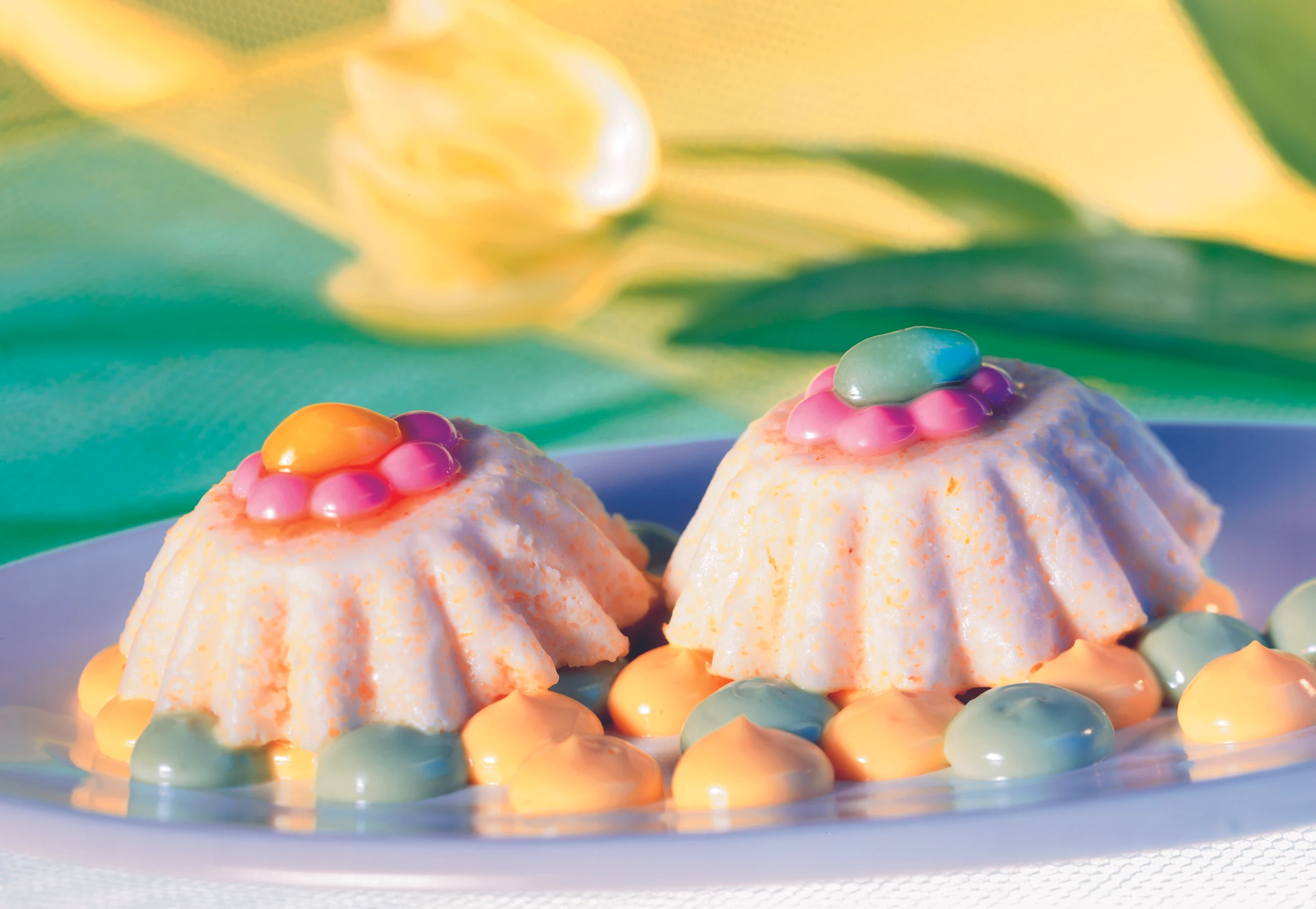 Für die Garnitur Obers mit Zucker cremig schlagen. Obers in drei Portionen teilen, mit Grenadinesirup, Eierlikör und Minzelikör einfärben. Zum Anrichten die Förmchen kurz in heißes Wasser tauchen und die Flammeris auf Teller stürzen. Flammeris mit färbigen Oberstupfern und Dragee-Eiern garnieren.