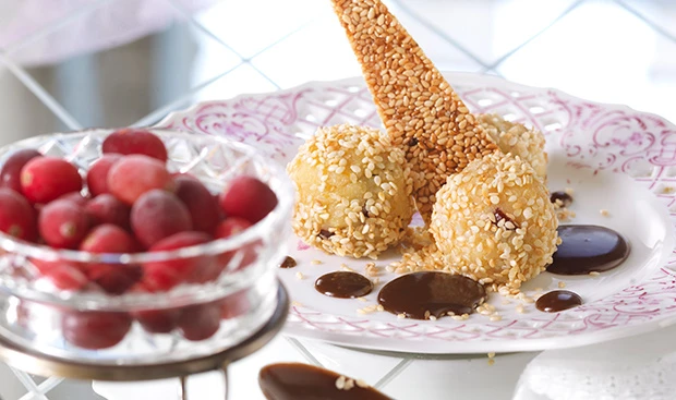 - Aus der Grießmasse 20 Knödel formen und im gerösteten Sesam wälzen. Knödel mit der Sauce anrichten und mit den Sesamecken garniert servieren.