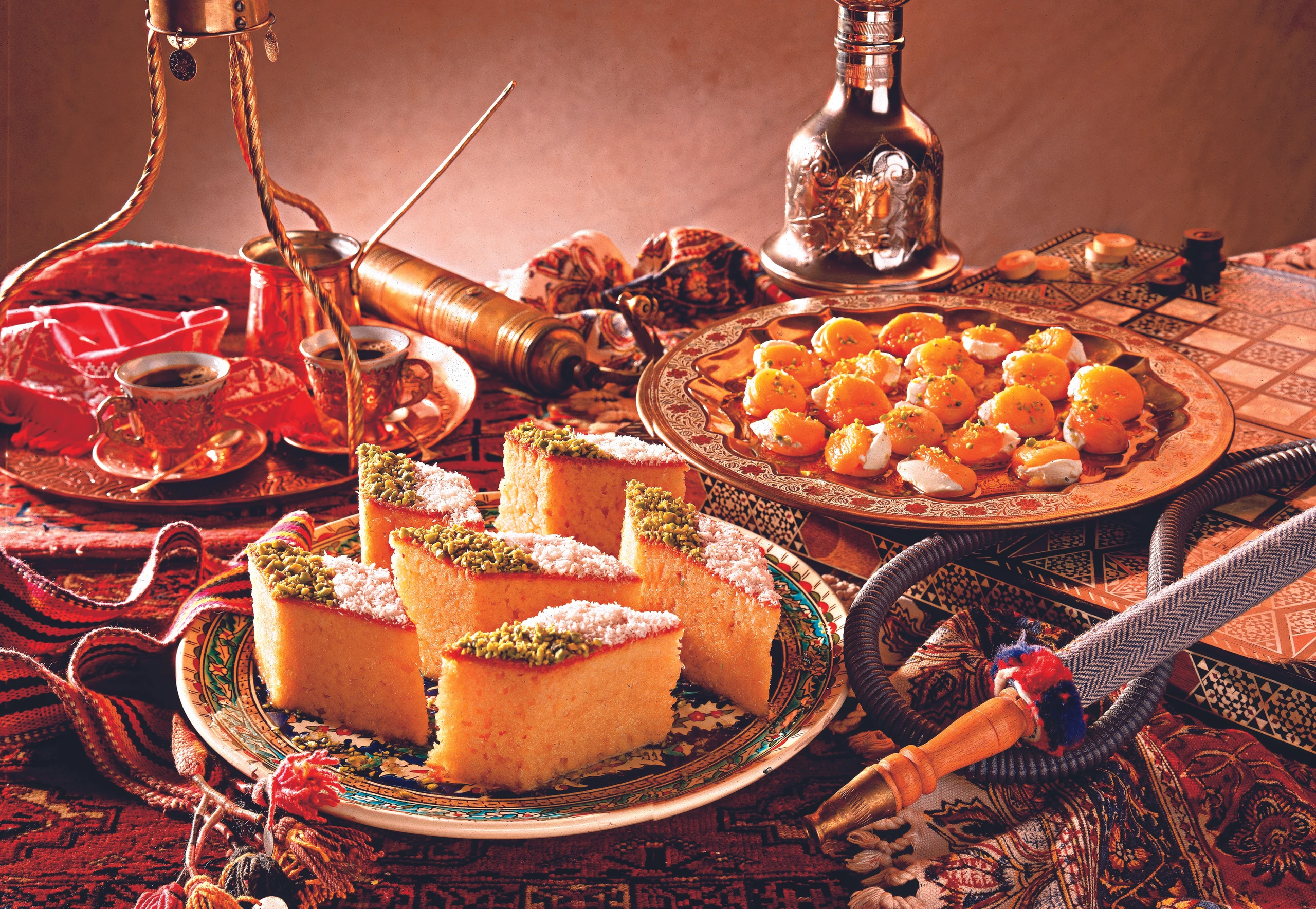Kuchen mit Alufolie zudecken und Sirup einziehen lassen (dauert ca. 1/2 Stunde). Kuchen herausheben und mit geschlagenem Obers (in der Türkei verwendet man Kaymak; es ist vergleichbar mit Creme fraîche) und dem restlichen Sirup servieren. Eventuell zusätzlich mit gehackten Pistazien und Kokosett bestreuen.