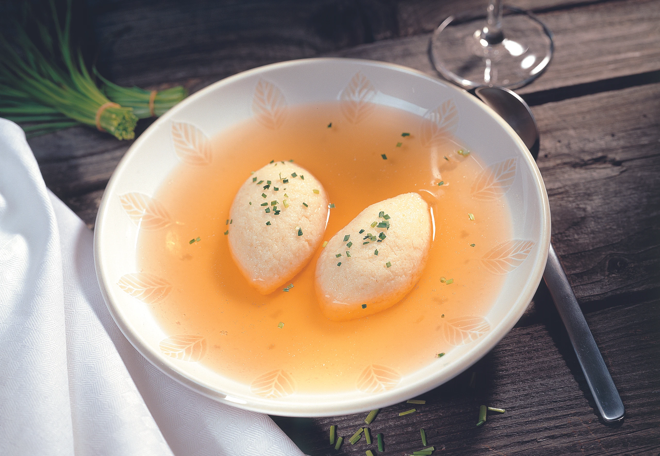 Nockerln mit einem Siebschöpfer aus dem Kochwasser heben, abtropfen lassen und mit Suppe anrichten. Suppe mit Schnittlauch bestreut servieren.