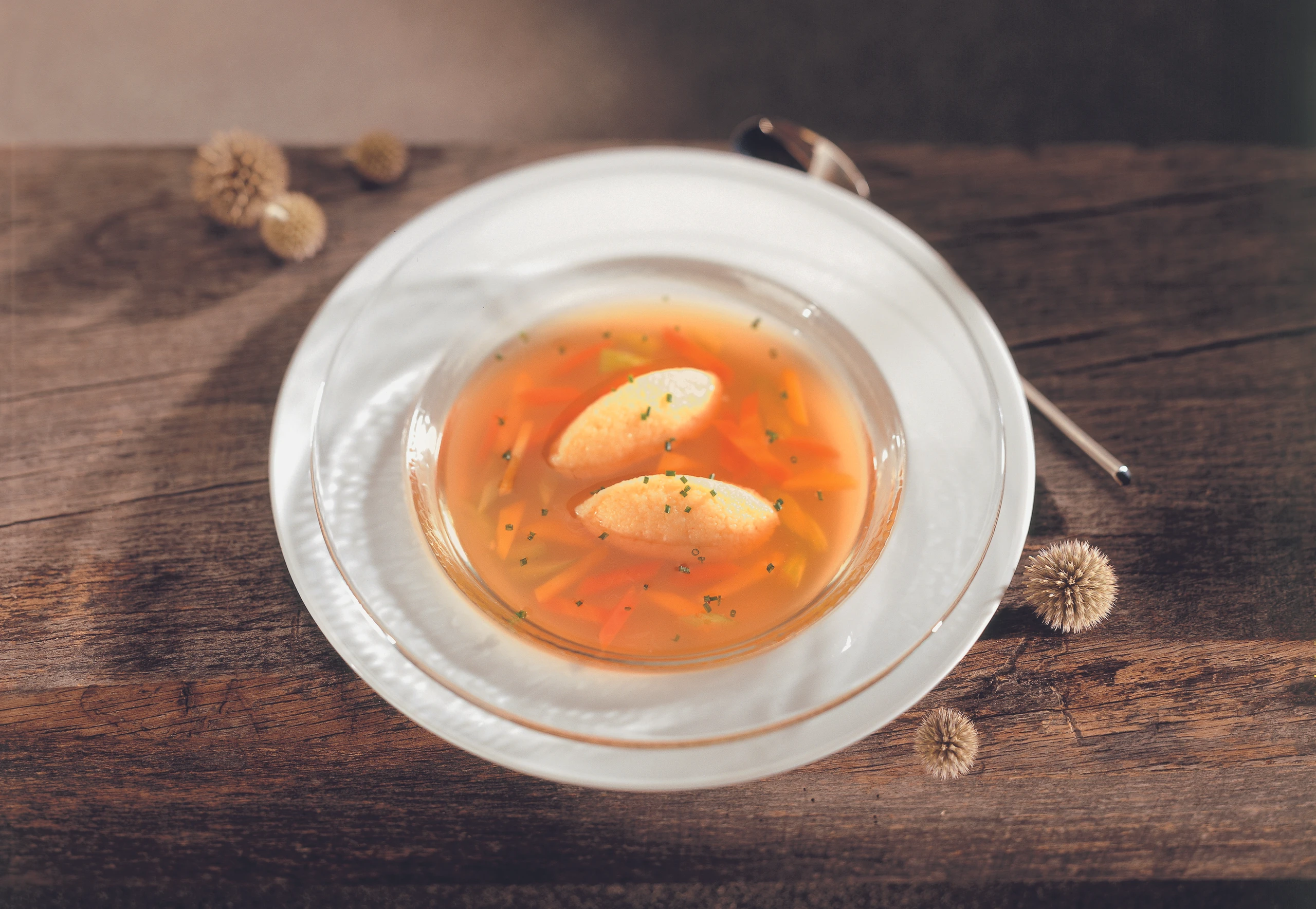 Nockerl mit einem Siebschöpfer aus dem Kochwasser heben, gut abtropfen lassen und mit den Gemüsestreifen in der Suppe anrichten. Suppe mit Schnittlauch bestreut servieren.