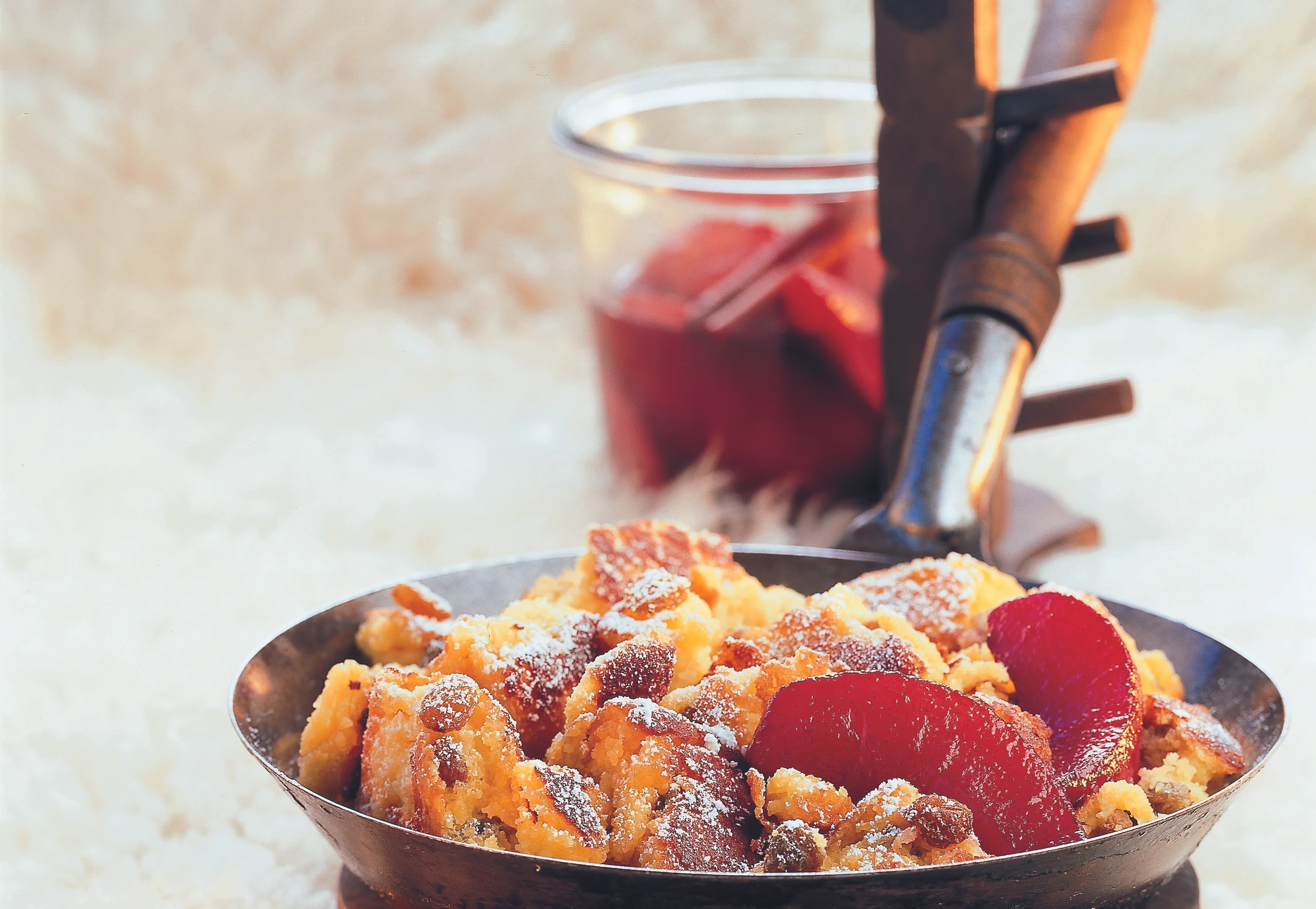 Masse mit zwei Gabeln zerpflücken. Den Schmarren mit Staubzucker bestreuen und mit dem Rotwein-Birnenkompott rasch servieren.