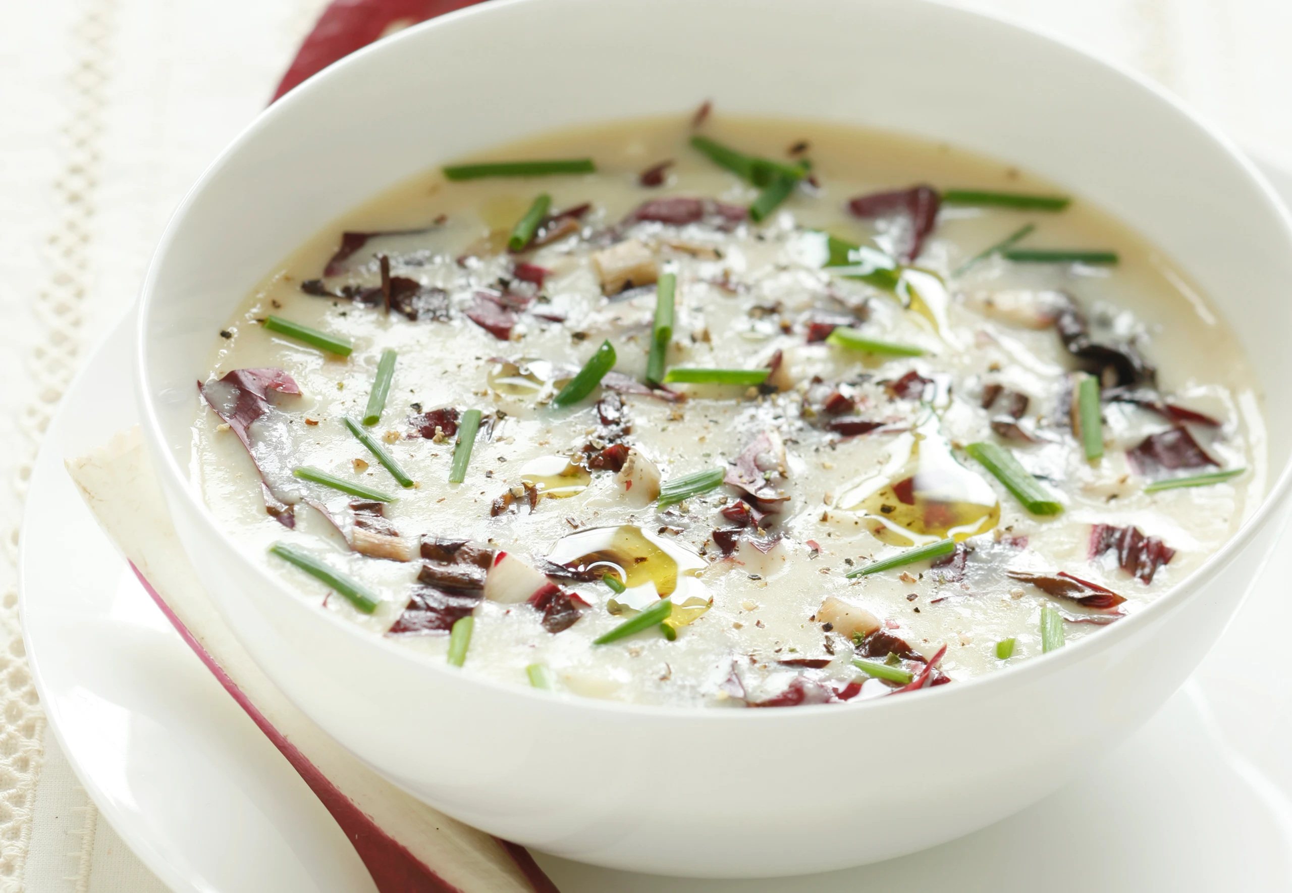 Radicchio und Schnittlauch in die Suppe rühren. Suppe kurz erhitzen, mit Salz, Pfeffer, Muskat und Zitronensaft abschmecken.