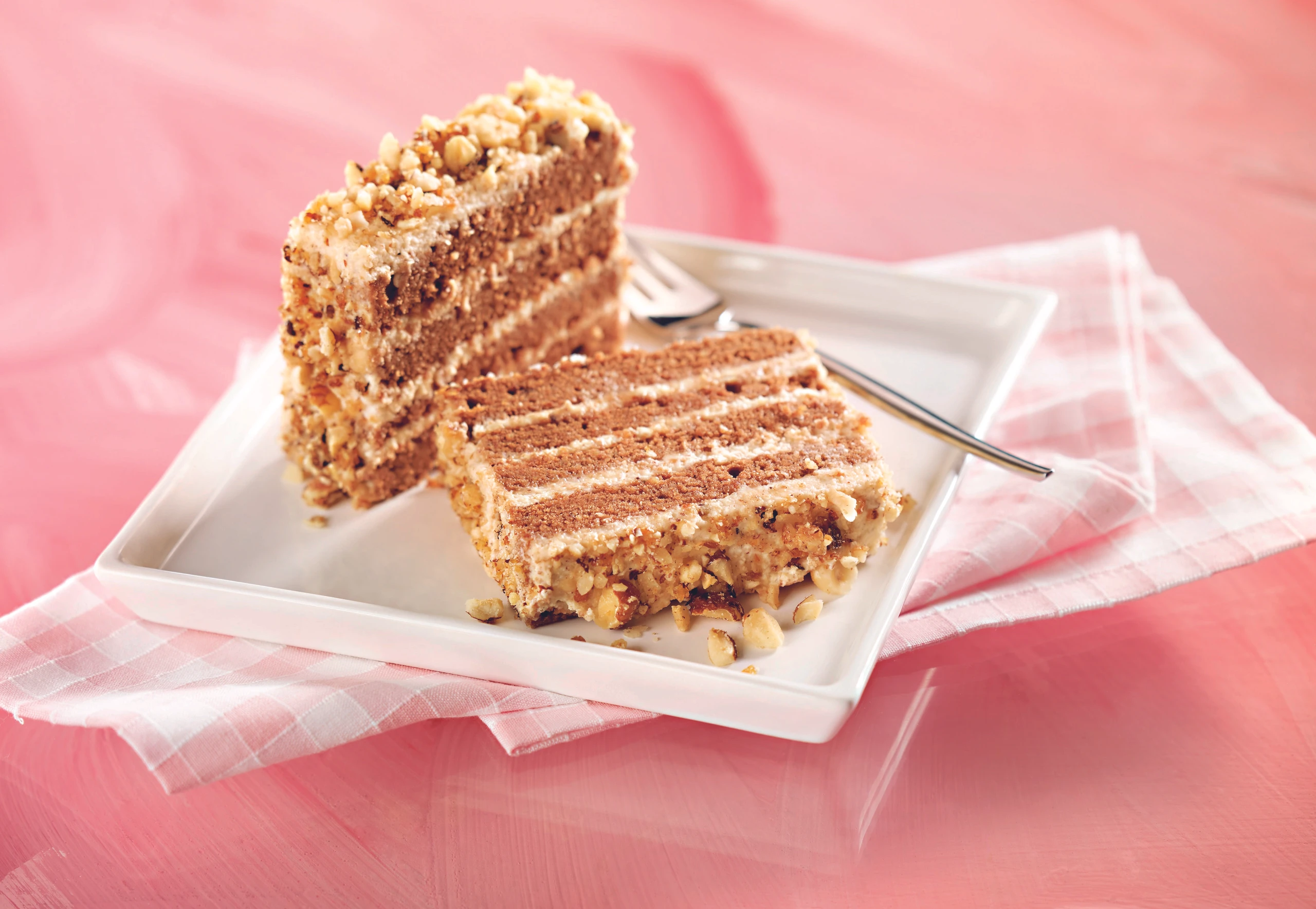 Vom Kuchen mitgebackenes Papier abziehen. Kuchen der Breite nach in 4 Streifen schneiden. Streifen mit drei Vierteln von der Creme bestreichen und übereinandersetzen. Schnitte mit übriger Creme rundum einstreichen und für 3 Stunden kühl stellen.
