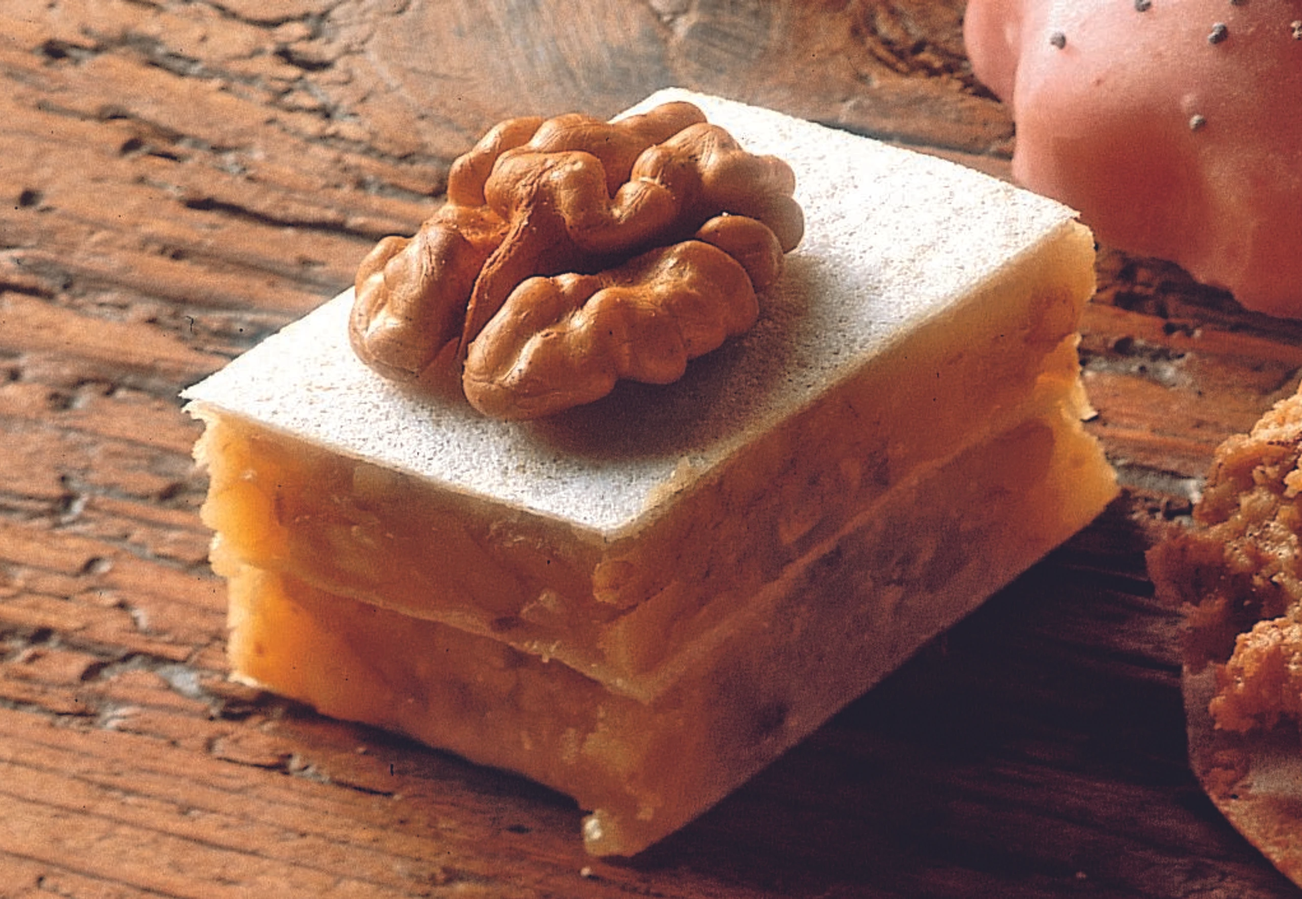 Schnitte in Würfel schneiden, jeden Würfel mit einem Tupfer Marillenmarmelade und einer Walnusshälfte belegen. Bis zum Servieren kühl lagern.