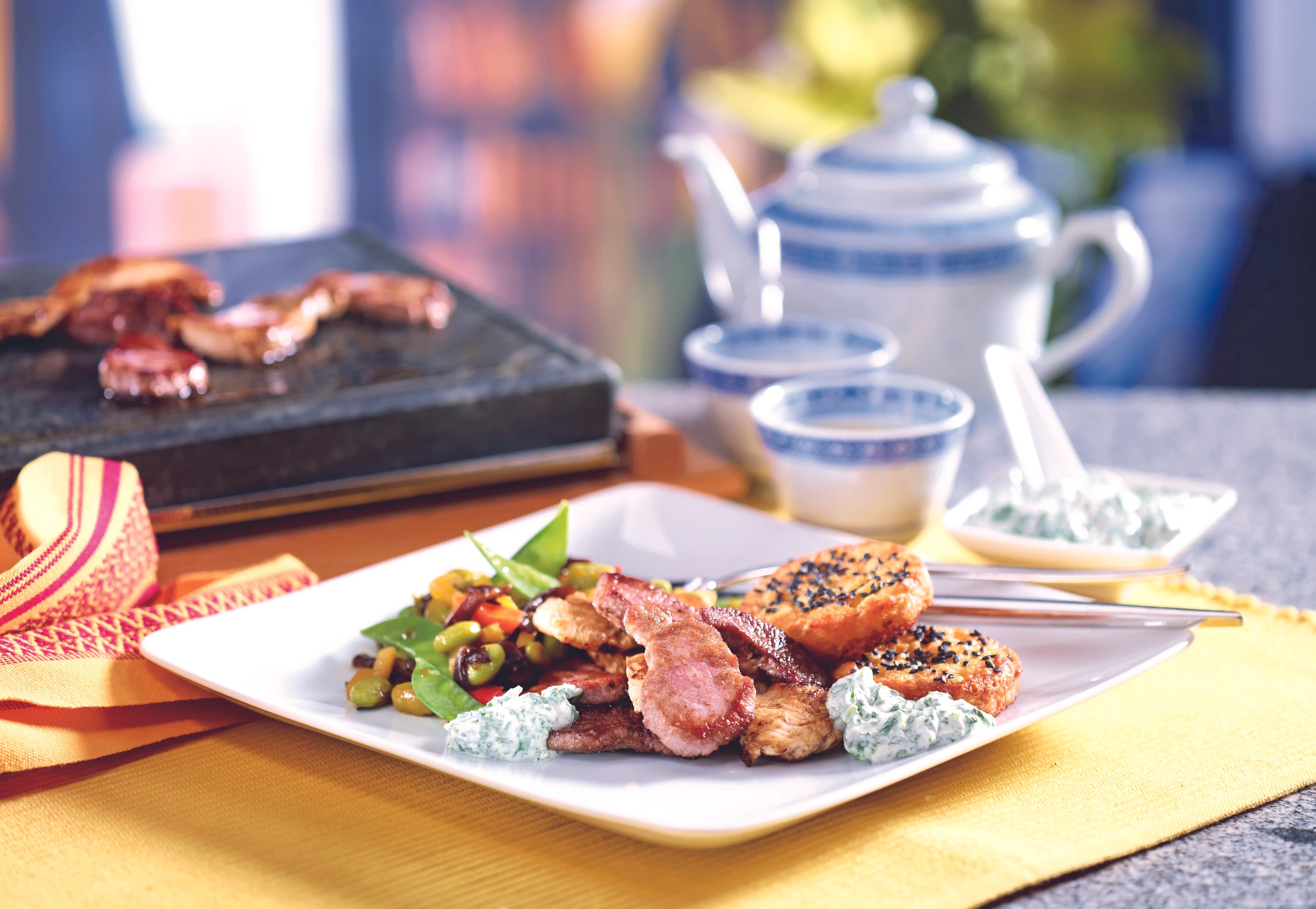 Steinplatte oder Teppanyaki vorheizen. Fleisch braten, mit Rucolasauce, Röstinchen und Asiagemüse servieren.