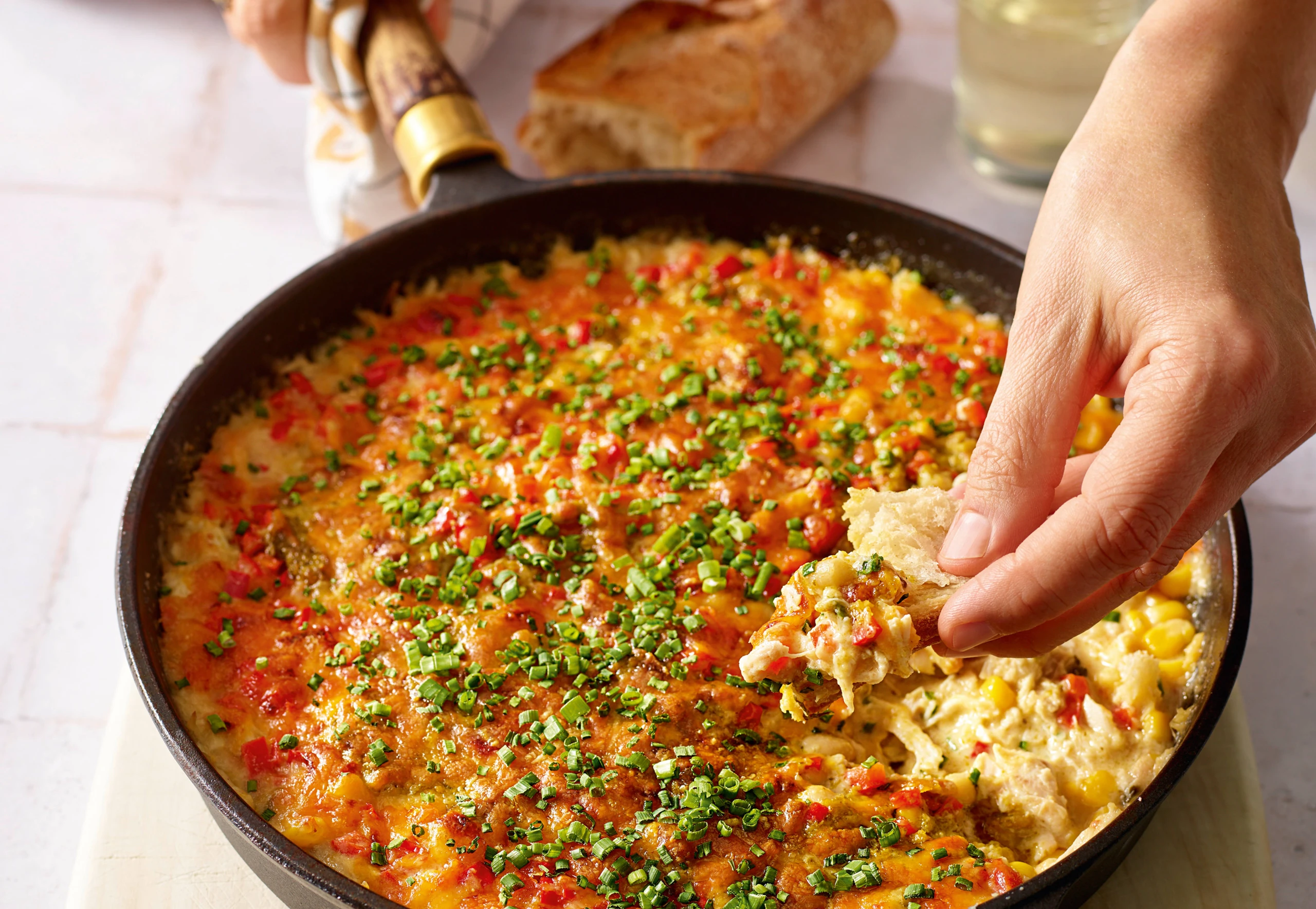 5 Minuten überkühlen lassen, dann mit restlichen Kräutern bestreuen. Mit Baguette, getoastetem Brot oder Tortillachips servieren.