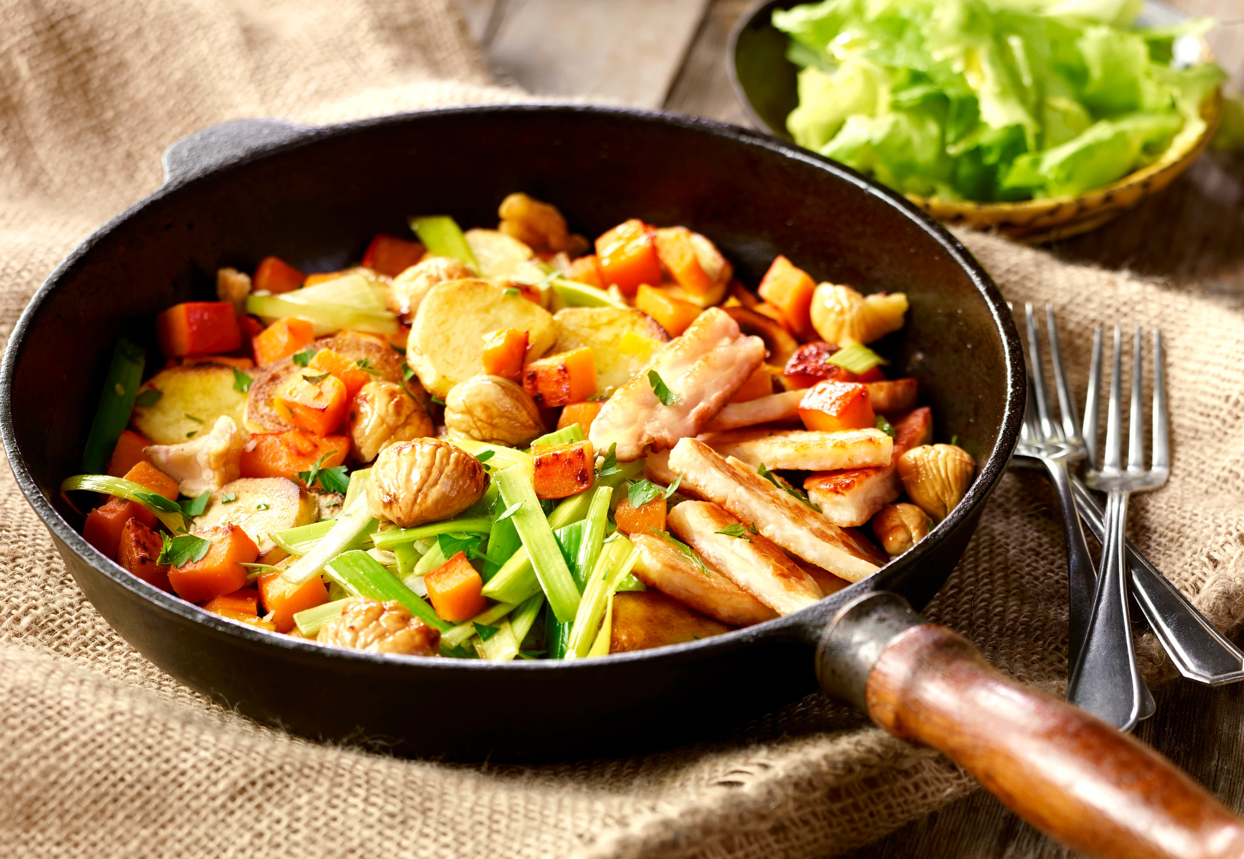 Gröstl mit Maroni, Kürbis und Halloumi