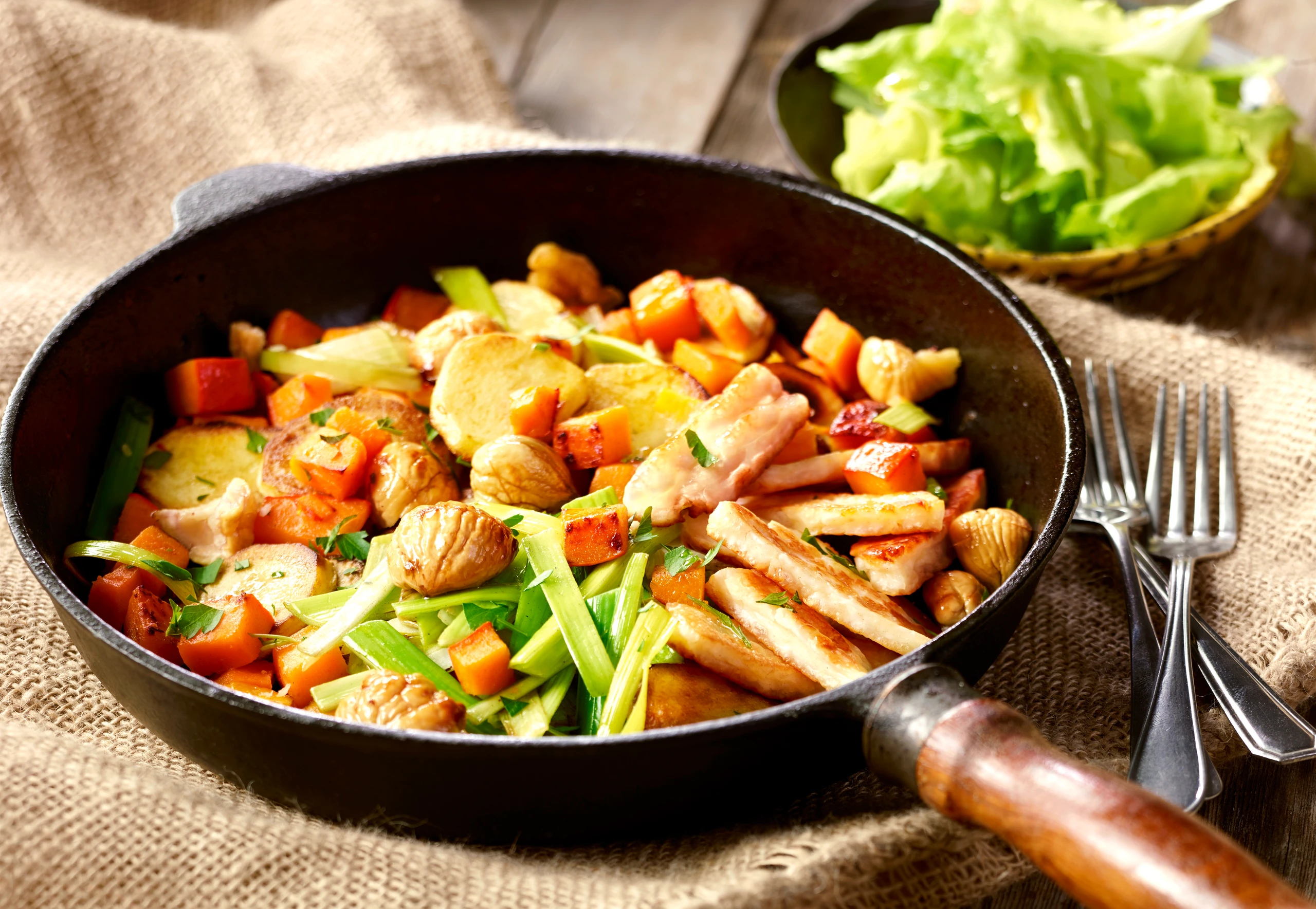 Erdäpfel, Halloumi, Lauch, Hokkaido, Maroni und Petersilie vermischen. Gröstl mit Salz, Pfeffer und Kümmel würzen. Salat marinieren. Gröstl mit dem Salat anrichten.