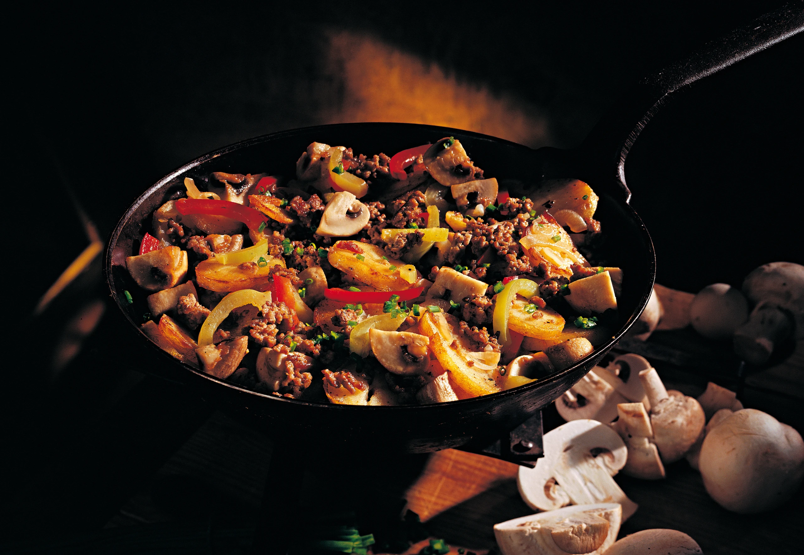 In einer großen Pfanne Zwiebel, Champignons und Paprika anschwitzen, herausheben und warmstellen.