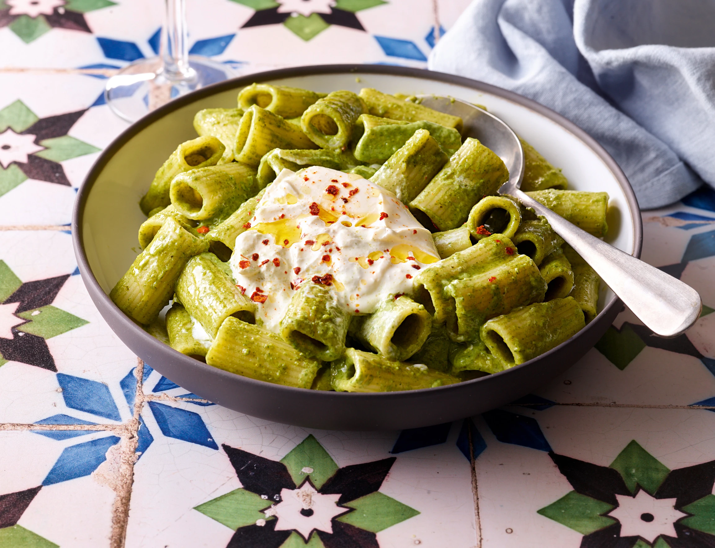 Rigatoni mit Burrata, Olivenöl und Chili garniert servieren.