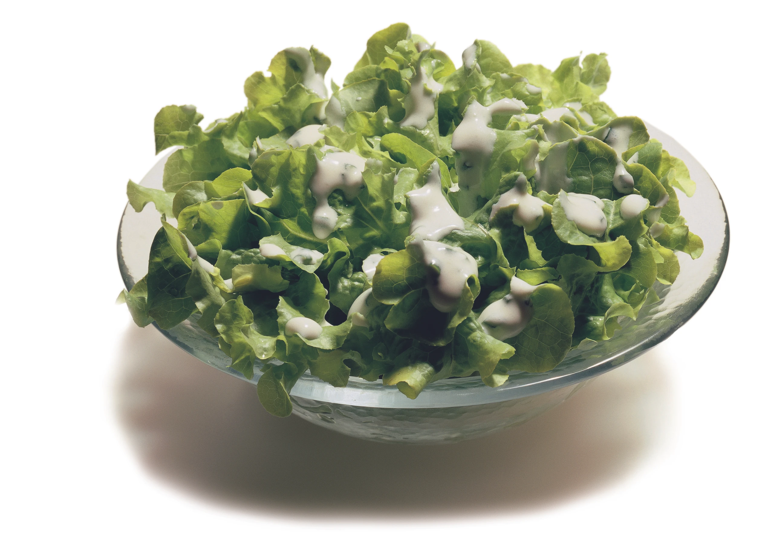 Eichblattsalat putzen, zerpflücken, waschen und gut abtropfen lassen. Joghurt mit Salz, Pfeffer und einigen Tropfen Zitronensaft würzen und mit Milch verrühren. Weinessig mit Salz und Pfeffer verrühren. Olivenöl unter ständigem Rühren zugießen. Salat mit der klaren Marinade übergießen, behutsam vermischen und anrichten, dann mit der Joghurtmarinade beträufeln.