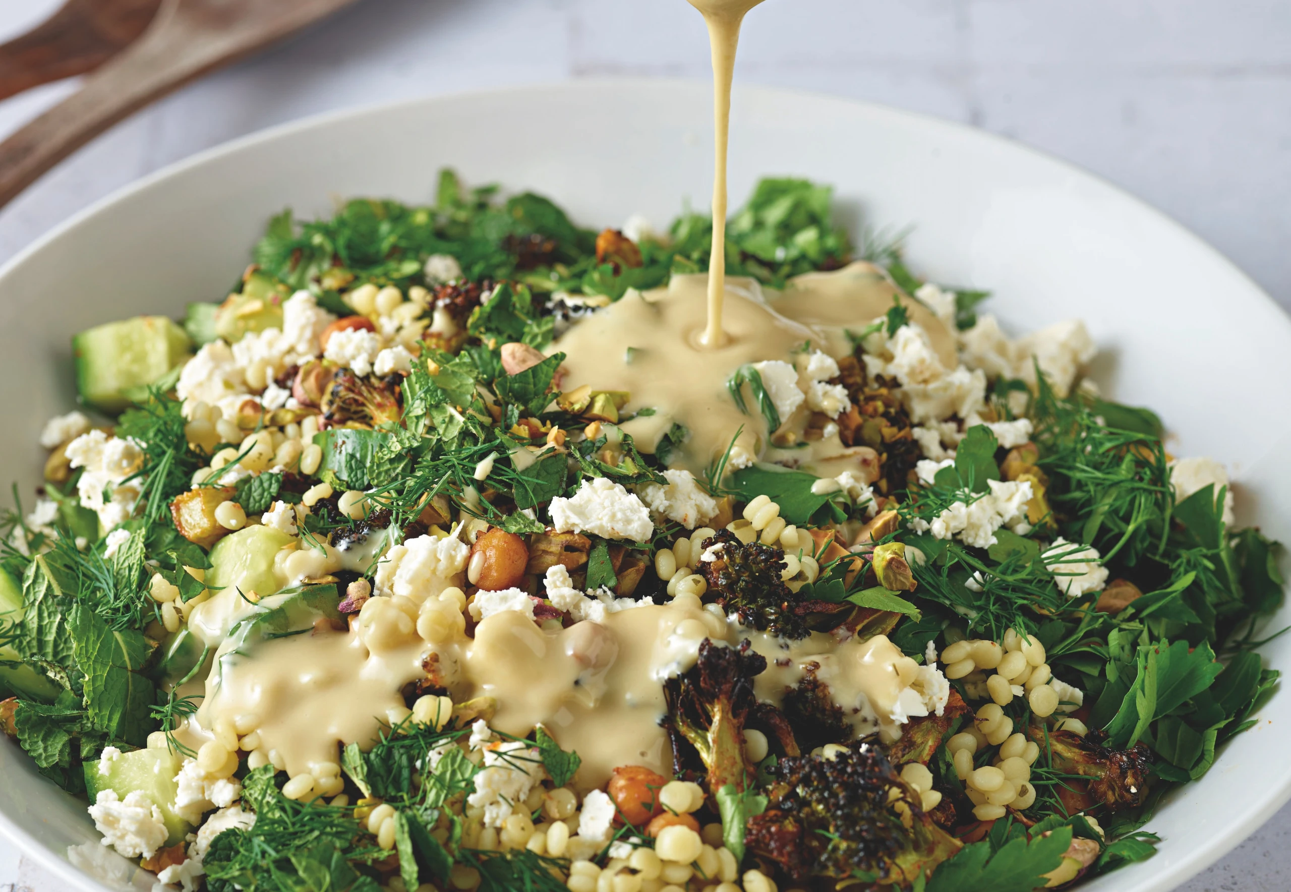 Gusto-Tipp: Riesencouscous (auch Perlcouscous oder griechischer Couscous genannt) erinnert in seiner Konsistenz eher an Pasta als an herkömmlichen Couscous. Er hat einen leicht nussigen Geschmack und ist in Bio-Läden, türkischen Supermärkten und online erhältlich. Ersatzweise können Sie Risoni verwenden, aber auch Bulgur passt wunderbar.