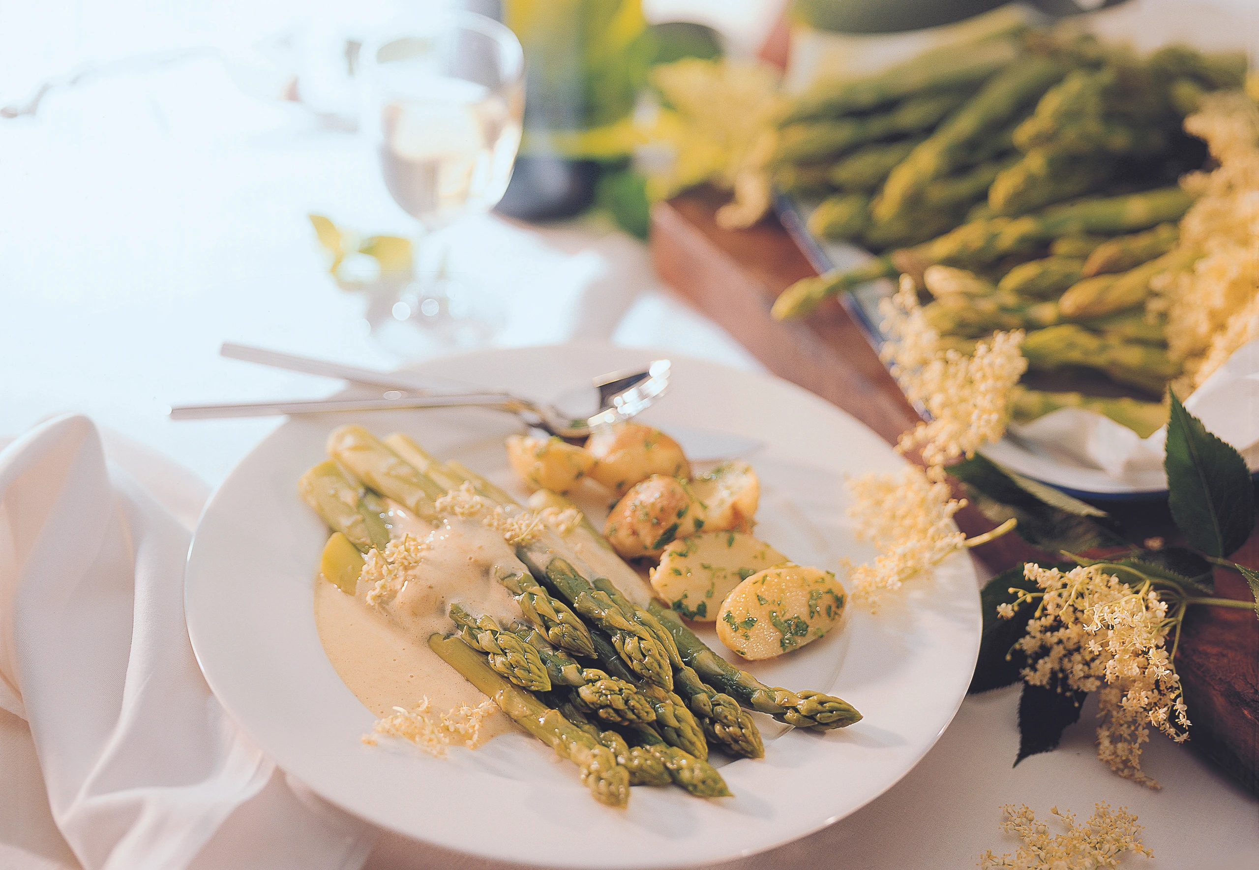 Spargel mit einem Siebschöpfer aus dem Kochfond heben und sofort mit dem Holundersabayon servieren. Als Beilage passen Petersilerdäpfel.