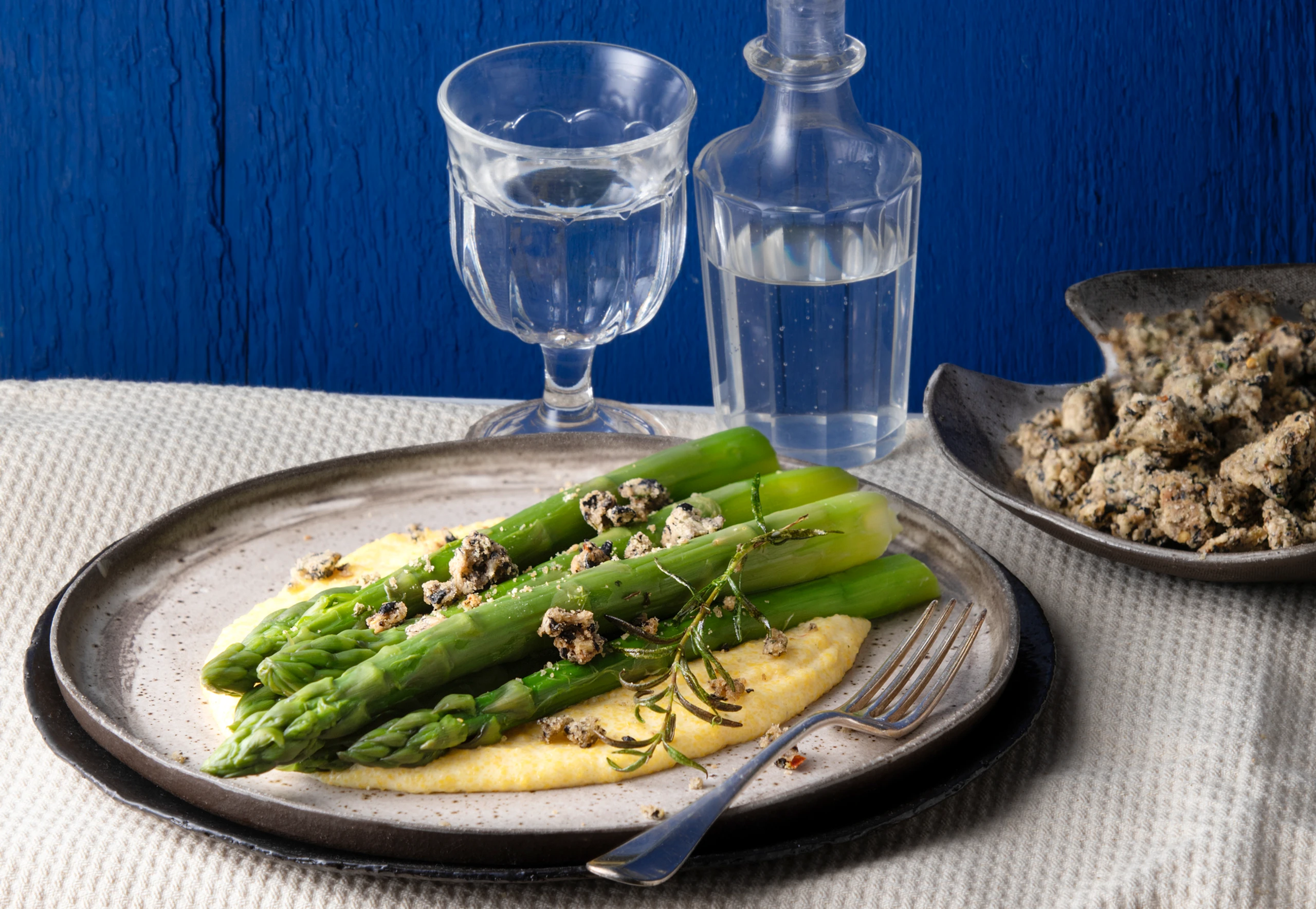 Grüner Spargel auf Polenta mit Oliven-Crumble