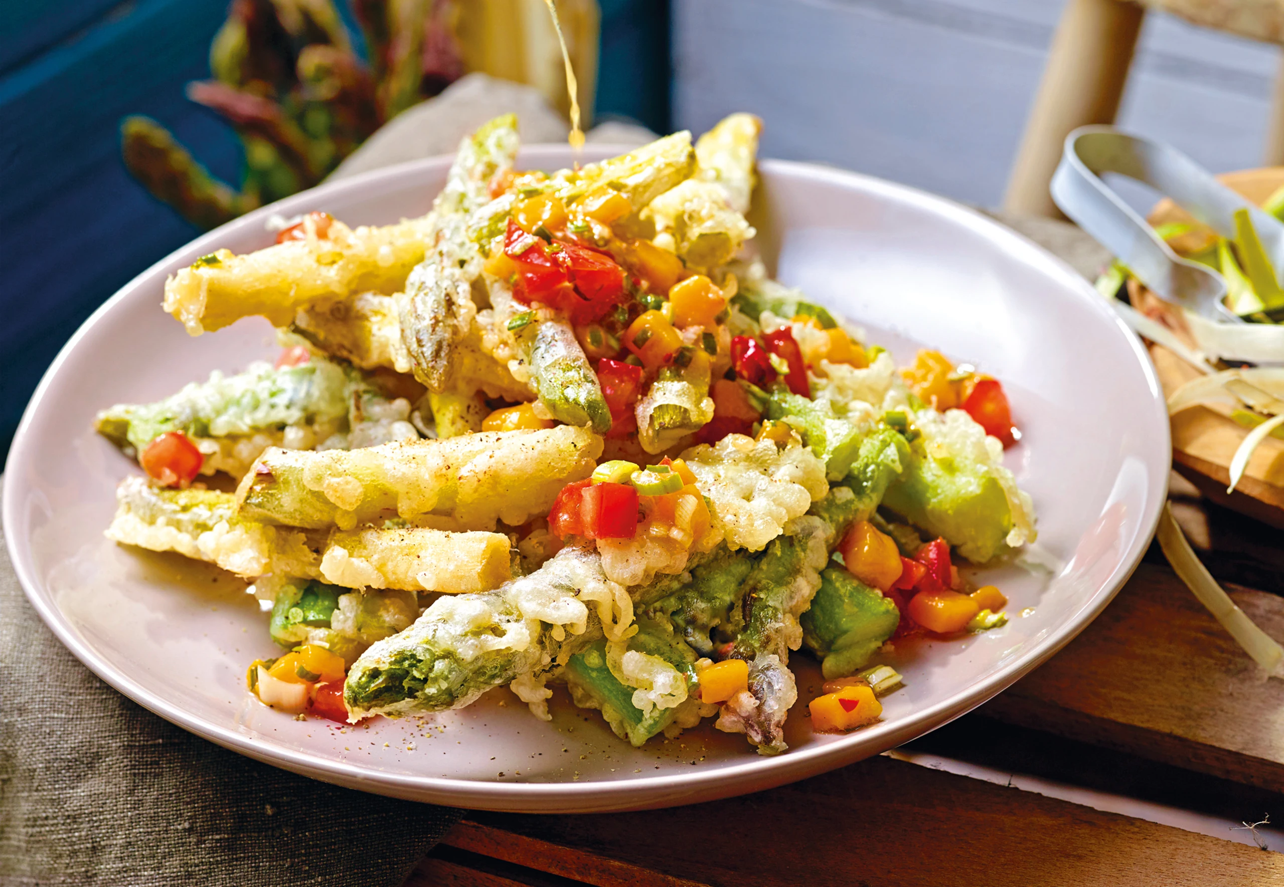 3 Finger hoch Öl erhitzen. Spargelstücke in den Teig tauchen und im heißen Öl in mehreren Arbeitsgängen backen. Herausheben, abtropfen lassen und im Rohr warm stellen. Spargel anrichten und mit der Salsa servieren.