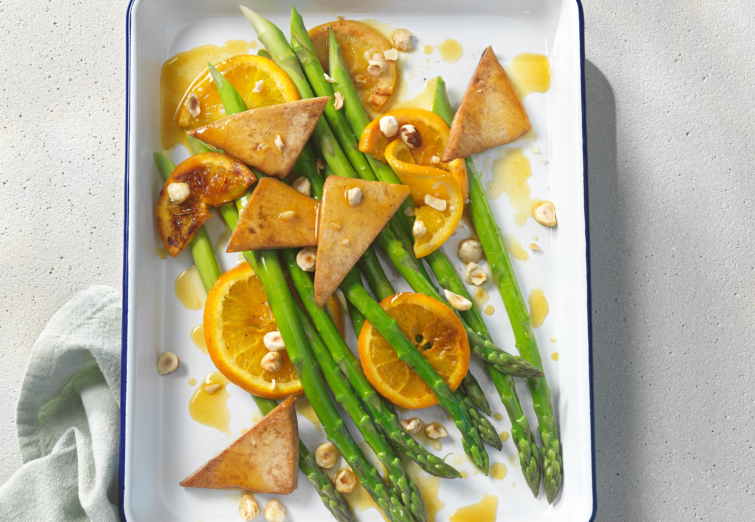 Grüner Spargel mit Tofu und Orangen