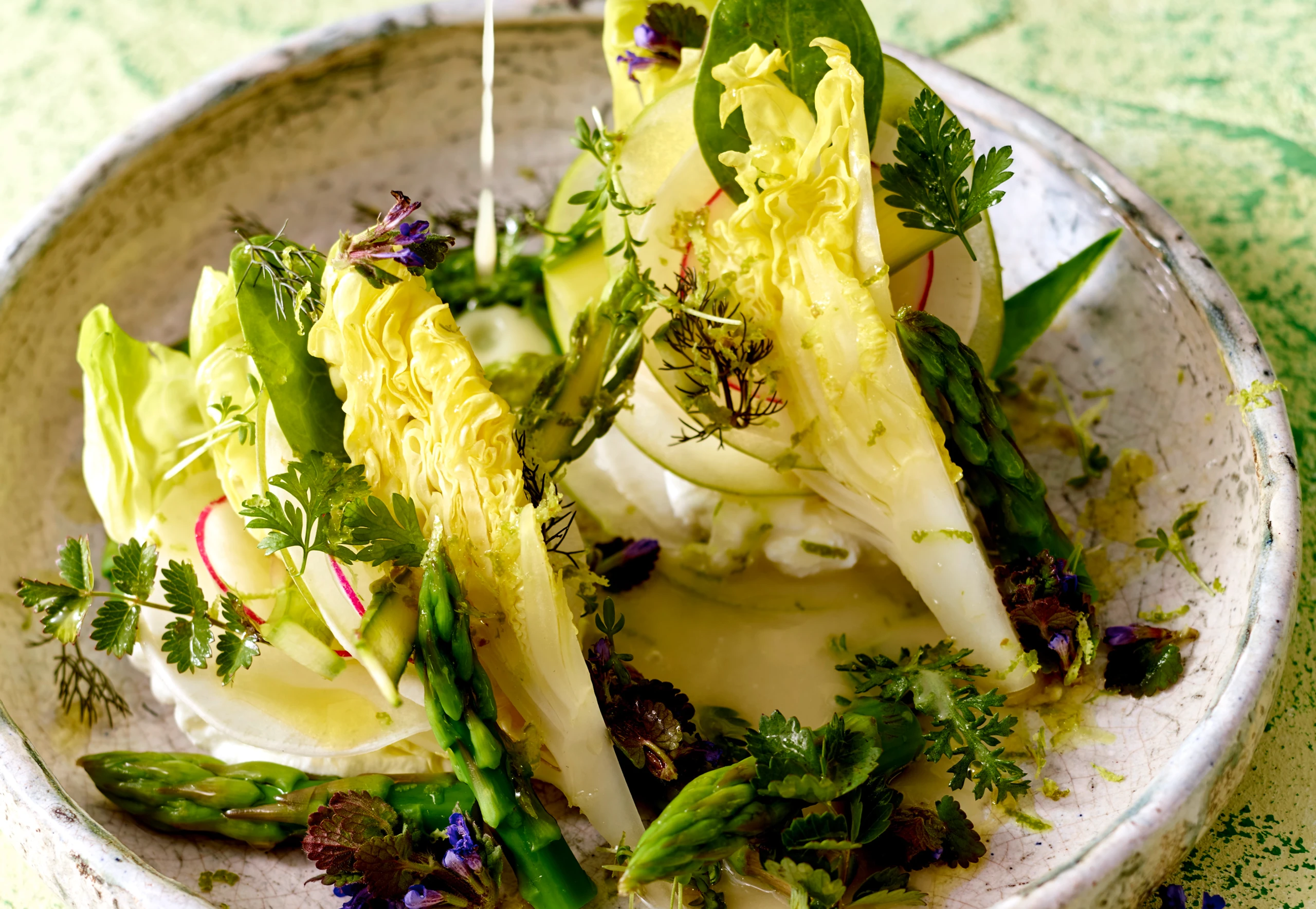 Spargelstangen, 1 Apfel, Radieschen und Navette dünn hobeln. Frischkäse auf Teller setzen. Salatstücke leicht aufblättern, Apfel- und Gemüsescheiben zwischen die Blätter stecken, auf den Käse setzen. Spargelspitzen dazu anrichten, Kräuter und Dressing darüber geben.