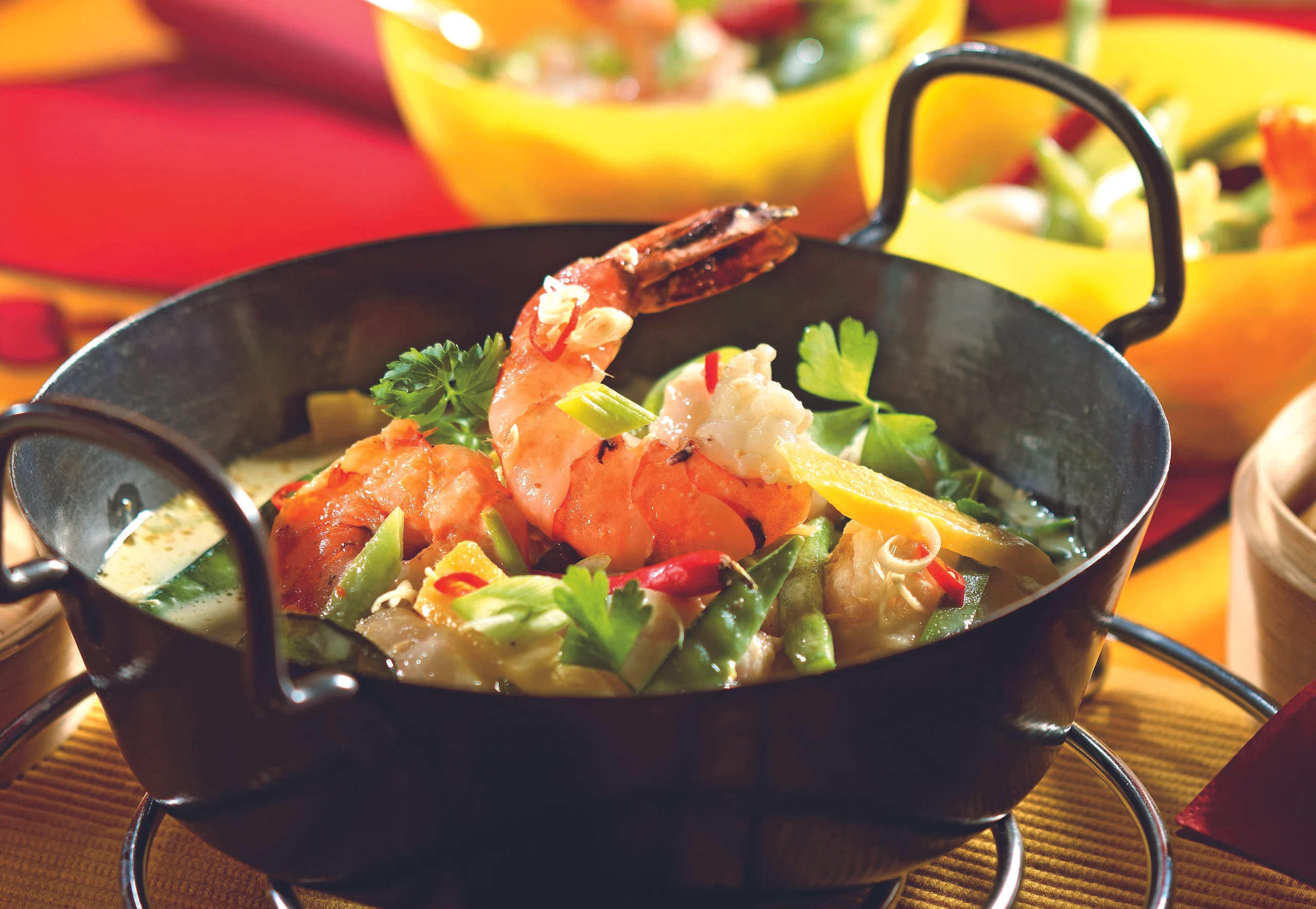 Fisch in mundgerechte Stücke schneiden. Garnelen aus der Schale lösen und entdarmen. Gelbe Rüben schälen und in dünne Scheiben schneiden, Jungzwiebeln putzen und in Ringe schneiden. Fisolen und Erbsenschoten putzen und schräg halbieren. Zitronengras und Chilis in feine Ringe schneiden.