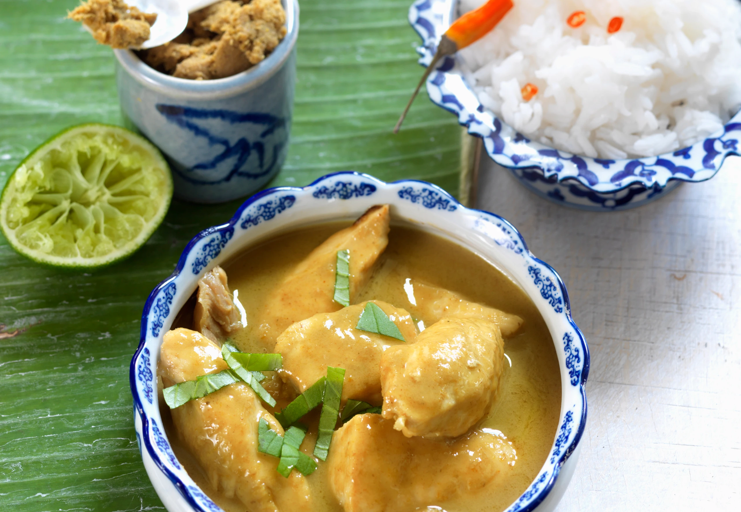 Huhn in Stücke teilen. Chilis in Ringe schneiden. Currypaste im Öl anrösten, Zucker zugeben, kurz anschwitzen, mit Kokosmilch, Fisch- und Sojasauce aufgießen. Hühnerstücke zugeben, Curry ca. 45 Minuten köcheln.