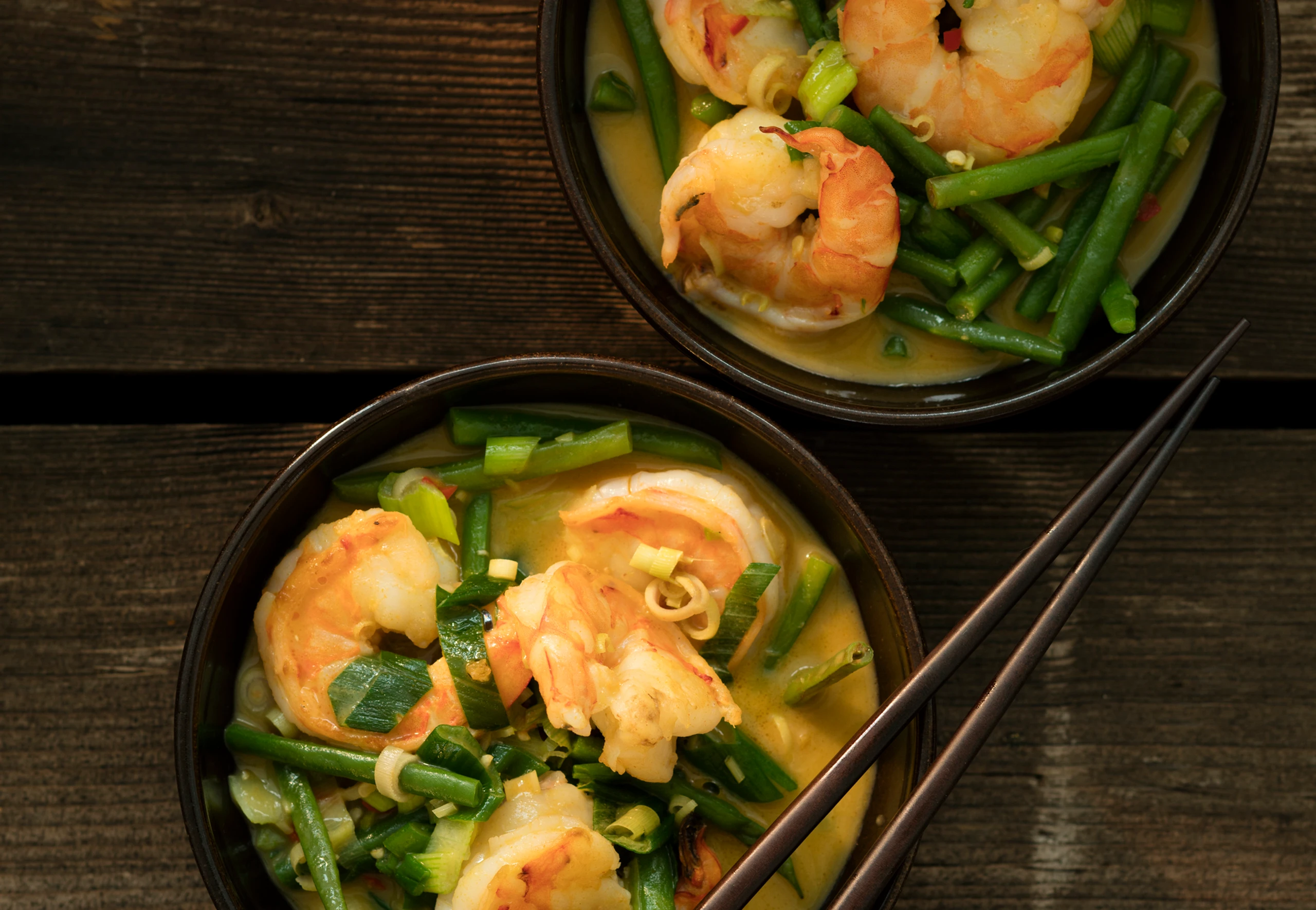 Garnelen in 3 EL Olivenöl beidseitig braten; aus der Pfanne nehmen. Bratrückstand mit Kokosmilch aufgießen, Currypaste und Fischsauce einrühren, Sauce aufkochen. Zitronengras, Jungzwiebel und Chili zugeben; kurz ziehen lassen.