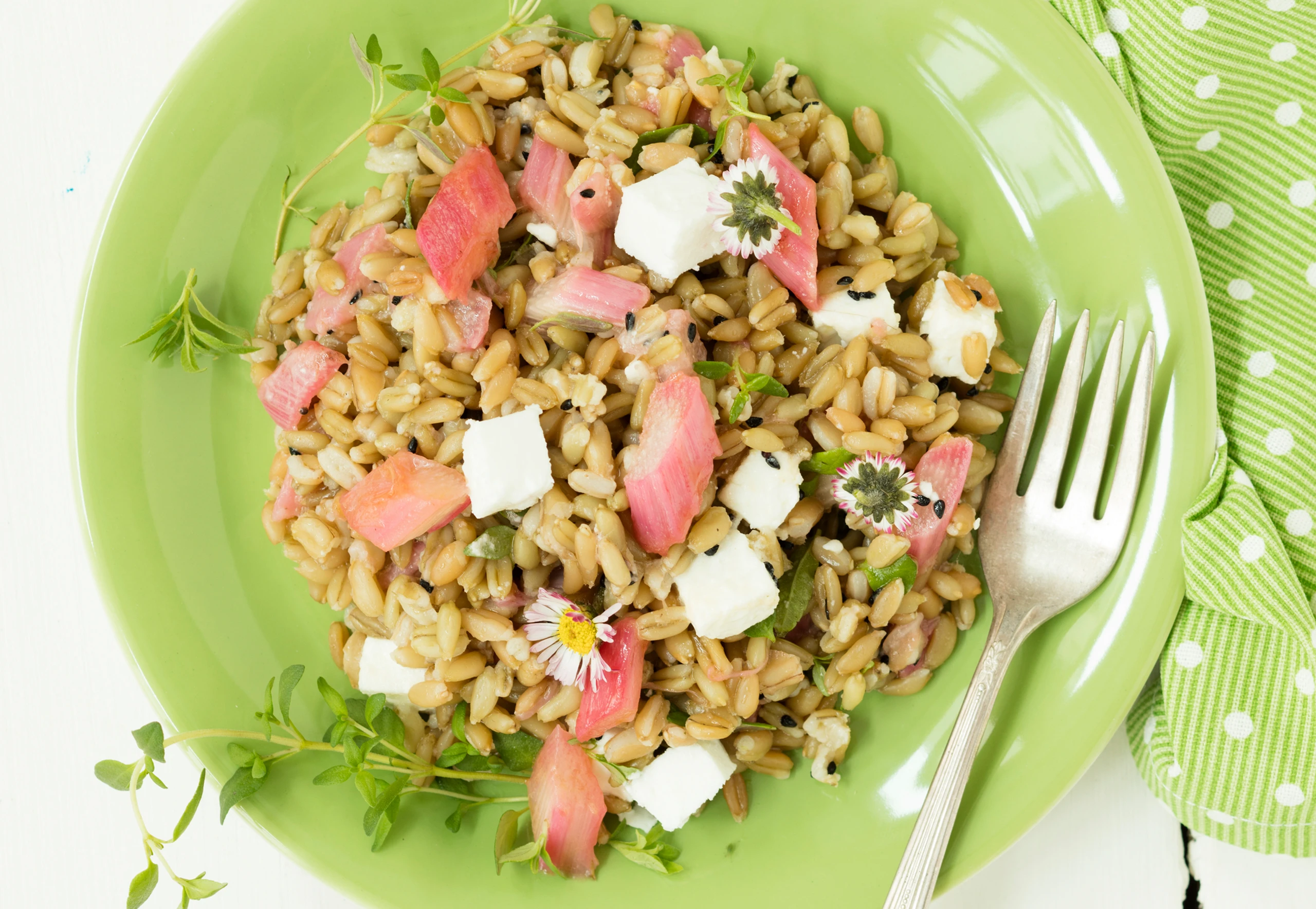 Grünkernsalat mit Schafkäse, Rhabarber und Kräutern