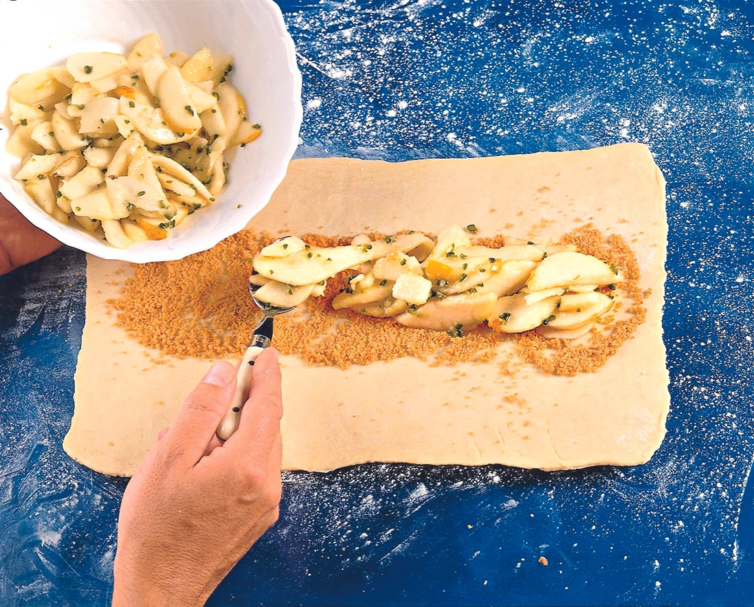 - Einfache Tour: Teig mit Mehl bestreuen, umdrehen und ca. 40 x 30 cm groß ausrollen.
