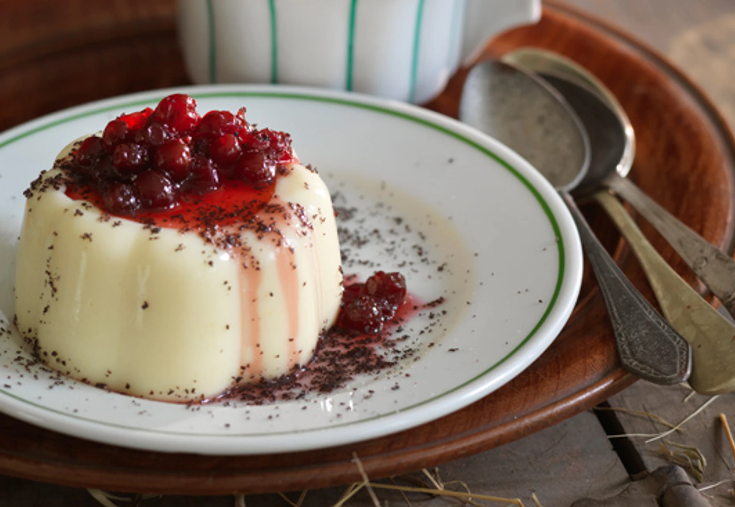 Desserts aus den Förmchen stürzen, mit Mohn und Preiselbeerkompott garniert servieren.